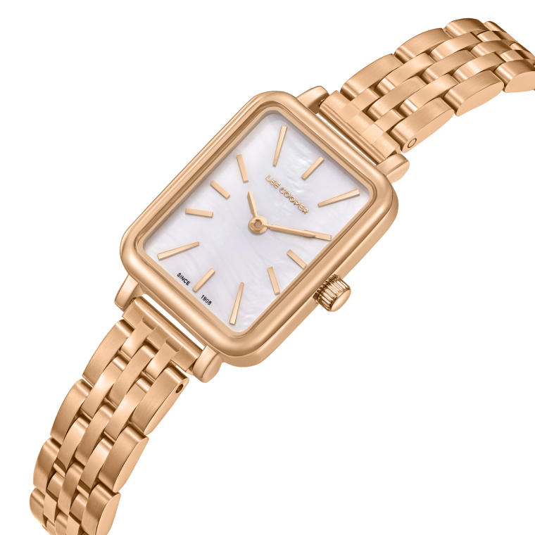 Женские наручные часы Lee Cooper LC08121.420 — это изысканная модель, сочетающая элегантный дизайн и практичность. Корпус выполнен из суперметалла с IP-покрытиемIP-покрытиеМетод ионного напыления. Демонстрирует повышенную устойчивость к истиранию, окислению и химическим веществам. Под воздействием высокого давления и температуры около 1500°C молекулы металла надёжно соединяются с частицами корпуса часов. розового цвета , придавая часам уникальный и утончённый вид. Перламутровый циферблат с метками в виде штрихов добавляет свежий и стильный акцент, делая часы привлекательными для различных случаев. Модель оснащена надёжным кварцевым механизмом, обеспечивающим точность и долговечность. Минеральное стеклоМинеральное стеклоМинеральное стекло представляет собой искусственно выращенный минерал кварца. Такое стекло отличается особой устойчивостью к повреждениям и царапинам. Уступает по некоторым качествам сапфировому стеклу. защищает циферблат от повреждений и царапин, сохраняя его презентабельный вид. Водонепроницаемость 50 метров защищает часы от случайных брызг, что делает их подходящими для повседневных ситуаций, таких как мытьё рук или прогулки под лёгким дождём. Раскладная застёжкаРаскладная застёжкаТакой тип застёжки используется только на браслетах из металла. Она никогда не раскрывается полностью, происходит разделение на 2 и более частей. Раскладывающая застёжка снизит вероятность потери часов к минимуму. обеспечивает удобную посадку и надёжность при ношении. В целом, эти часы являются отличным выбором для тех, кто ищет аксессуар, объединяющий классический стиль, уникальное цветовое решение и функциональность. Их гармоничное сочетание серебристых и золотистых оттенков с элегантным перламутровым циферблатом и качественным механизмом делает их идеальным дополнением к любому гардеробу — от официального до повседневного.