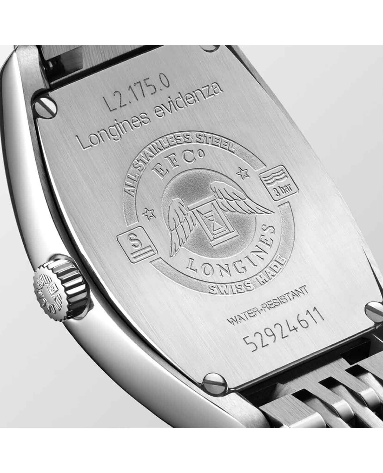 Женские швейцарские кварцевые часы Longines Evidenza L2.175.4.71.6. Сапфировое стеклоСапфировое стеклоПрочный и надёжный материал из кристалла сапфира синтетического происхождения, характеризующийся особой твёрдостью и устойчивостью к царапинам и повреждениям. устойчивое к появлению царапин, обладающее высокой прозрачностью. Корпус часов изготовлен из нержавеющей стали. Часы, минуты, малая секундная стрелка в положении 6 часов. Класс водозащиты: 30 метров, позволит защитить корпус от случайных брызг или капель дождя. Стальной браслет на застёжке «бабочка» с кнопкамиЗастёжка "бабочка"Такой вид застёжки дополняется предохранителями, помогающими избежать случайного раскрытия браслета. Обладают изящным исполнением. .