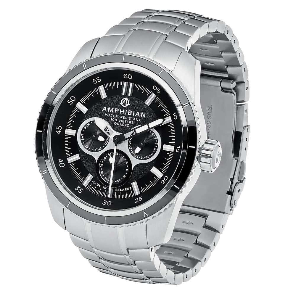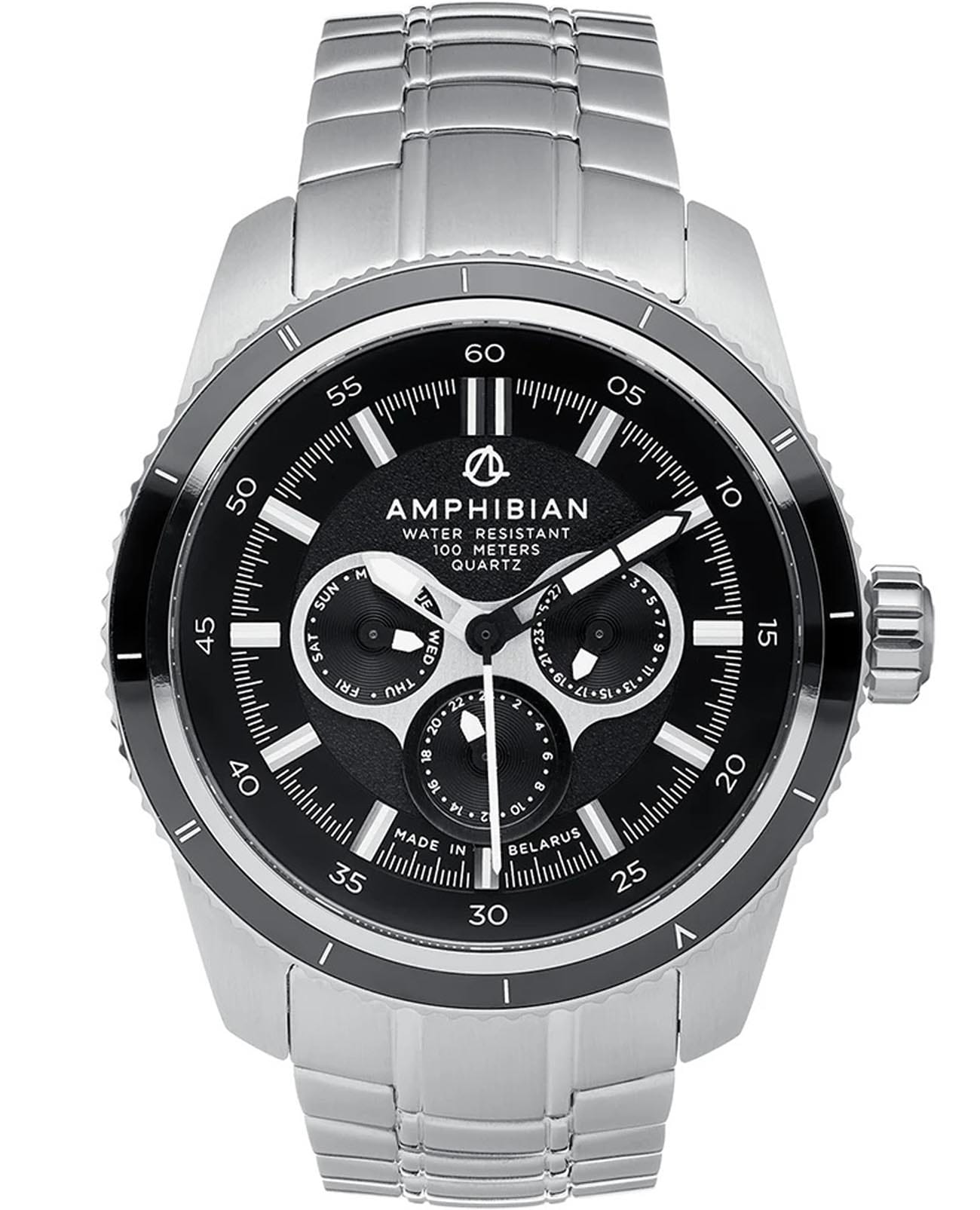 Мужские наручные часы Луч Amphibian 96720564 — это стильное сочетание элегантности и современного дизайна. Элегантный корпус диаметром 46.8 мм выполнен из нержавеющей стали, который придает модели особый изысканный вид. Циферблат защищен сапфировым стекломСапфировое стеклоПрочный и надёжный материал из кристалла сапфира синтетического происхождения, характеризующийся особой твёрдостью и устойчивостью к царапинам и повреждениям., обеспечивающим устойчивость к царапинам. Метки в виде штрихов. Часы оснащены кварцевым механизмом, а браслет из нержавеющей стали фиксируется на раскладной застёжкеРаскладная застёжкаТакой тип застёжки используется только на браслетах из металла. Она никогда не раскрывается полностью, происходит разделение на 2 и более частей. Раскладывающая застёжка снизит вероятность потери часов к минимуму.. Поворотный безельБезельВнешний ободок, закрепляющий стекло. В спортивных часах так называется поворотное кольцо с делениями на циферблате, выполняет роль таймера – замеряет отрезки времени на шкале. Неподвижный безель – элемент декора. Однонаправленно вращающийся безель на дайверских часах позволяет фиксировать моменты погружения и выныривания на поверхность. с PVD-покрытиемPVDУльтратонкое покрытие наносится в технике вакуумного напыления, сочетает в себе нитрид титана особой прочности со слоем золота или оксида хрома. Несёт в себе декоративную или защитную функцию. черного цвета. Вынесенный циферблат с 24-х часовым указателем времени, индикацией даты и дня недели. Стрелки и метки с люминесцентным покрытиемЛюминесцентное покрытиеПозволяет считывать показания времени в темноте. Производители наносят на стрелки, часовые индексы, безель или поверхность циферблата светонакопительный состав, дающий холодное свечение. позволяют легко считывать время даже в условиях недостаточного освещения. Водозащита 10 бар позволит защитить корпус от случайных брызг или капель дождя. Луч — отличный выбор для тех, кто ценит утонченность и качество.