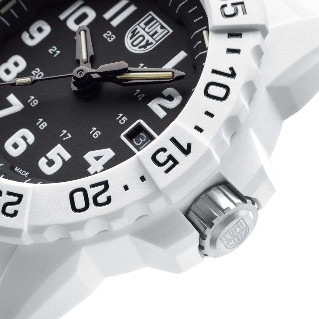 Часы Luminox XS.3507.WB — это надежные и стильные швейцарские часы с кварцевым механизмом, оснащенные калибром Ronda 515. Корпус выполнен из пластика, усиленного прессованным карбоном CARBONOX, что обеспечивает прочность и долговечность. Черный циферблат защищен минеральным стекломМинеральное стеклоМинеральное стекло представляет собой искусственно выращенный минерал кварца. Такое стекло отличается особой устойчивостью к повреждениям и царапинам. Уступает по некоторым качествам сапфировому стеклу. повышенной прочности, что делает его устойчивым к царапинам и ударам. Резиновый ремешок с классической застежкой обеспечивает комфортное ношение и надежность фиксации на запястье. Эти часы обладают впечатляющим уровнем водозащиты до 200 метров, что делает их подходящими для водных видов спорта и активного отдыха. Светящаяся метка на безелеБезельВнешний ободок, закрепляющий стекло. В спортивных часах так называется поворотное кольцо с делениями на циферблате, выполняет роль таймера – замеряет отрезки времени на шкале. Неподвижный безель – элемент декора. Однонаправленно вращающийся безель на дайверских часах позволяет фиксировать моменты погружения и выныривания на поверхность., который вращается в одном направлении, добавляет функциональности и удобства, особенно в условиях низкой освещенности. Технология LLTLLTLLT — это автономный механизм подсветки, основанный на использовании микроскопических газонаполненных элементов. Специальные герметичные капсулы из боросиликатного стекла, интегрированные в циферблат, генерируют свечение без необходимости подключения к внешним источникам энергии. Для их работы не требуется ни дополнительный свет, ни механическое воздействие (например, нажатие кнопки). Свечение возникает благодаря химическому процессу: реакция между тритием, заключенным в капсулах, и люминофорным покрытием создает стабильное автономное освещение. Технология обеспечивает энергетическую независимость и долговечность подсветки.-подсветки обеспечивает отличную видимость в темноте на протяжении 25 лет, позволяя контролировать время даже при полном отсутствии света. Часы поддерживают отображение времени в 12- и 24-часовом формате, а наличие календаря с указанием числа добавляет практичности. Заводная головка снабжена защитой и двойной уплотнительной прокладкой для обеспечения герметичности, а задняя крышка крепится на винтах для дополнительной надежности.