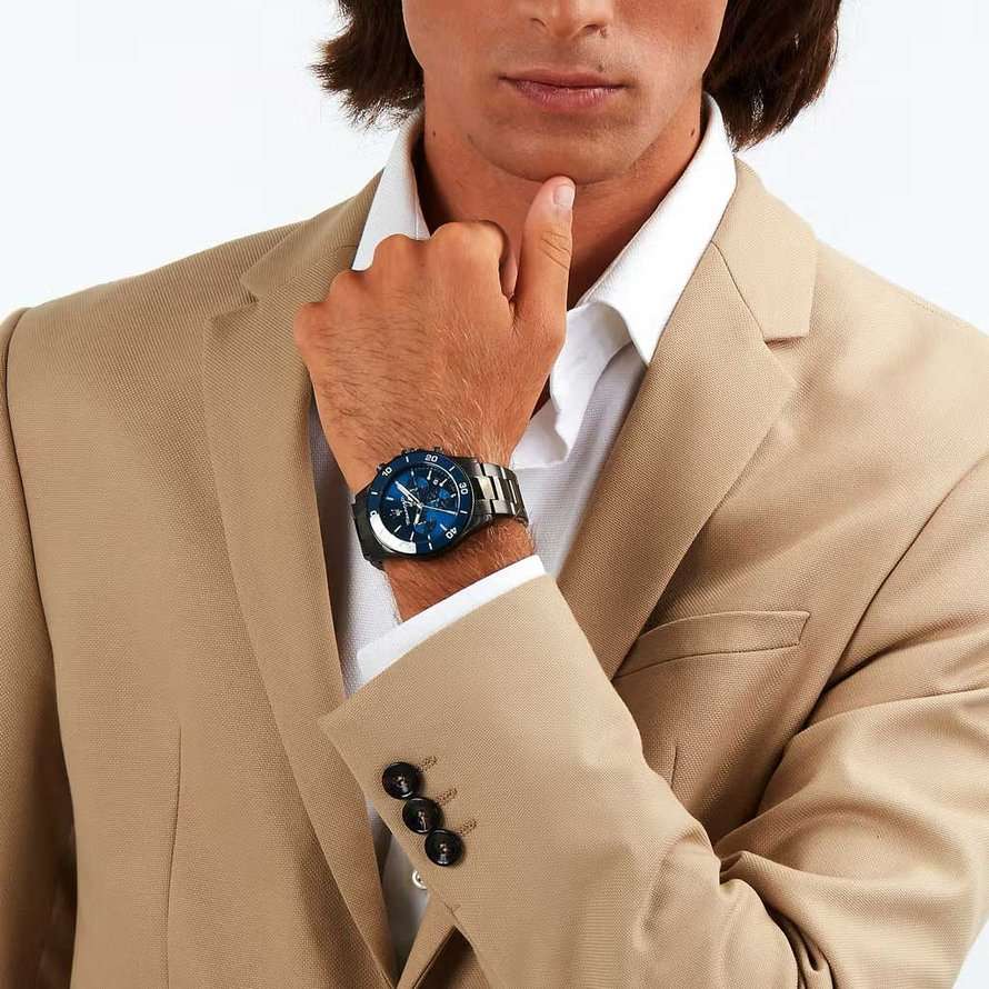 Мужские часы Maserati R8873600005 — это стильное сочетание элегантности и современного дизайна. Корпус из нержавеющей стали с PVD-покрытиемPVDУльтратонкое покрытие наносится в технике вакуумного напыления, сочетает в себе нитрид титана особой прочности со слоем золота или оксида хрома. Несёт в себе декоративную или защитную функцию. диаметром 43 мм идеально сбалансирован и элегантен. Минеральное стеклоМинеральное стеклоМинеральное стекло представляет собой искусственно выращенный минерал кварца. Такое стекло отличается особой устойчивостью к повреждениям и царапинам. Уступает по некоторым качествам сапфировому стеклу. защищает циферблат от царапин. Стальной браслет на застёжке-бабочке с кнопкамиЗастёжка "бабочка"Такой вид застёжки дополняется предохранителями, помогающими избежать случайного раскрытия браслета. Обладают изящным исполнением. идеально дополняют дизайн часов, обеспечивая комфортное ношение. Стрелки и метки с люминесцентным покрытиемЛюминесцентное покрытиеПозволяет считывать показания времени в темноте. Производители наносят на стрелки, часовые индексы, безель или поверхность циферблата светонакопительный состав, дающий холодное свечение.. БезельБезельВнешний ободок, закрепляющий стекло. В спортивных часах так называется поворотное кольцо с делениями на циферблате, выполняет роль таймера – замеряет отрезки времени на шкале. Неподвижный безель – элемент декора. Однонаправленно вращающийся безель на дайверских часах позволяет фиксировать моменты погружения и выныривания на поверхность. с керамической вставкой. Часы обладают впечатляющей водонепроницаемостью до 10 бар (100 метров), что делает их идеальными для повседневной носки. Метки в виде штрихов. Окошко даты с увеличительным стеклом находится в положении 3 часа. Часы-хронографХронографФункция позволяет измерять отрезки времени с особой точностью: часы, минуты, секунды. Верным признаком хронографа является наличие на циферблате 3 дополнительных окошек-счётчиков. оборудованы надёжным кварцевым механизмом с калибром Miyota JS25, обеспечивающим точность и долговечность.