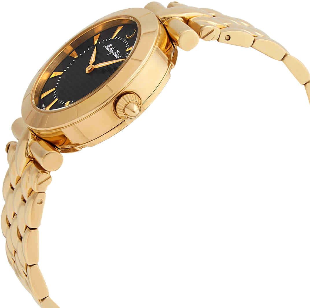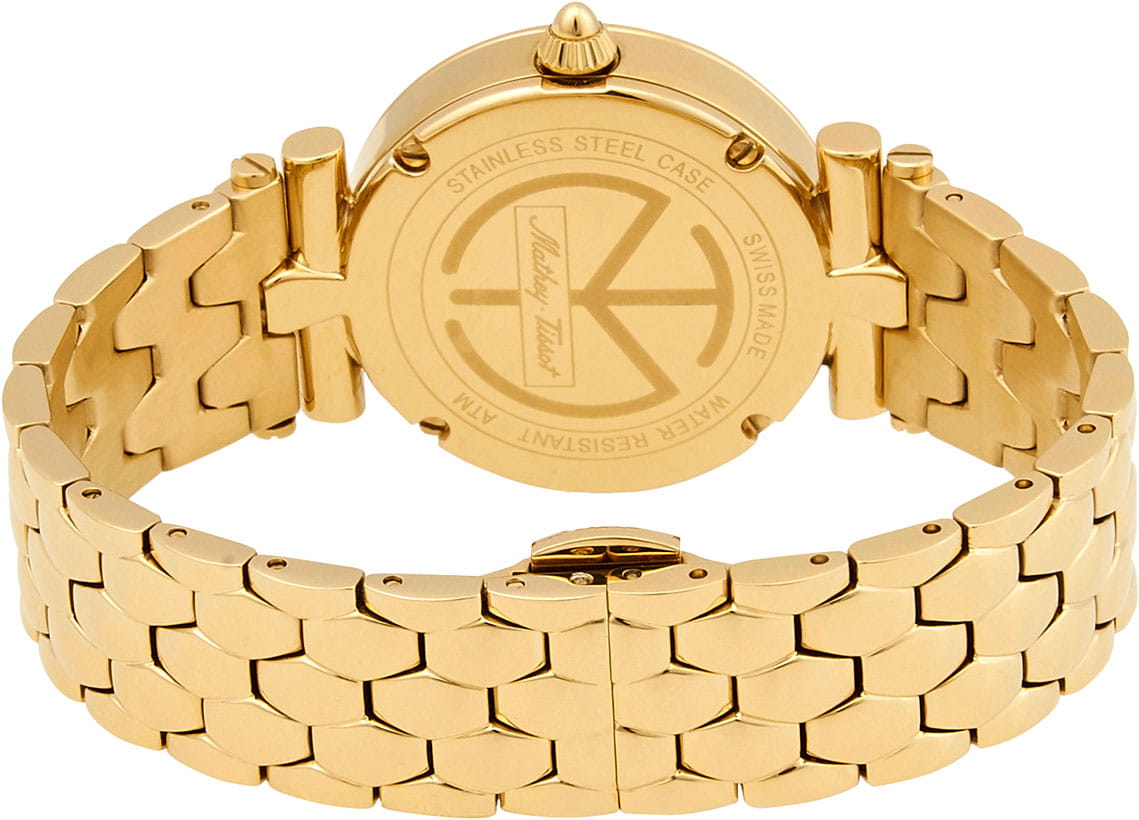 Женские кварцевые часы Mathey-Tissot Tarta D106PN — это стильное сочетание элегантности и современного дизайна. Изящный корпус выполнен из нержавеющей стали с PVD-покрытиемPVDУльтратонкое покрытие наносится в технике вакуумного напыления, сочетает в себе нитрид титана особой прочности со слоем золота или оксида хрома. Несёт в себе декоративную или защитную функцию. золотистого цвета, диаметром 34 мм и толщиной 8 мм, что придаст образу женственности и романтизма. Изысканный циферблат с метками в виде штрихов придает модели особый блеск. Циферблат защищен минеральным стекломМинеральное стеклоМинеральное стекло представляет собой искусственно выращенный минерал кварца. Такое стекло отличается особой устойчивостью к повреждениям и царапинам. Уступает по некоторым качествам сапфировому стеклу., обеспечивающий устойчивость к царапинам. Стрелки с люминесцентным покрытиемЛюминесцентное покрытиеПозволяет считывать показания времени в темноте. Производители наносят на стрелки, часовые индексы, безель или поверхность циферблата светонакопительный состав, дающий холодное свечение.. Часы оснащены надежным кварцевым механизмом. Стальной браслет с PVD-покрытиемPVDУльтратонкое покрытие наносится в технике вакуумного напыления, сочетает в себе нитрид титана особой прочности со слоем золота или оксида хрома. Несёт в себе декоративную или защитную функцию. на застёжке-бабочке с кнопкамиЗастёжка "бабочка"Такой вид застёжки дополняется предохранителями, помогающими избежать случайного раскрытия браслета. Обладают изящным исполнением. , гарантирует комфортное и безопасное ношение. Класс водозащиты: 50 метров позволит защитить корпус от случайных брызг или капель дождя. Mathey-Tissot  — отличный выбор для тех, кто ценит утонченность и качество.