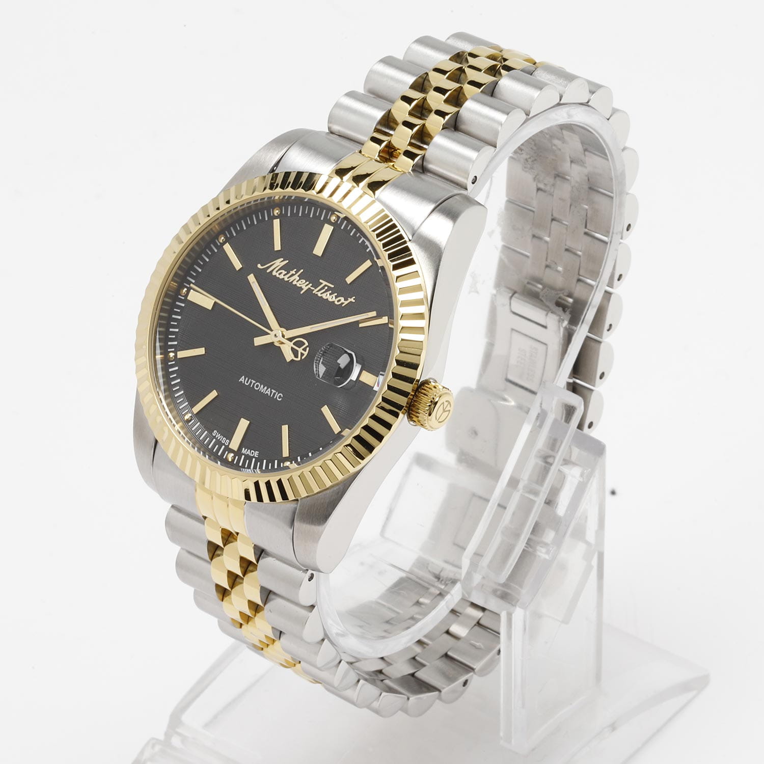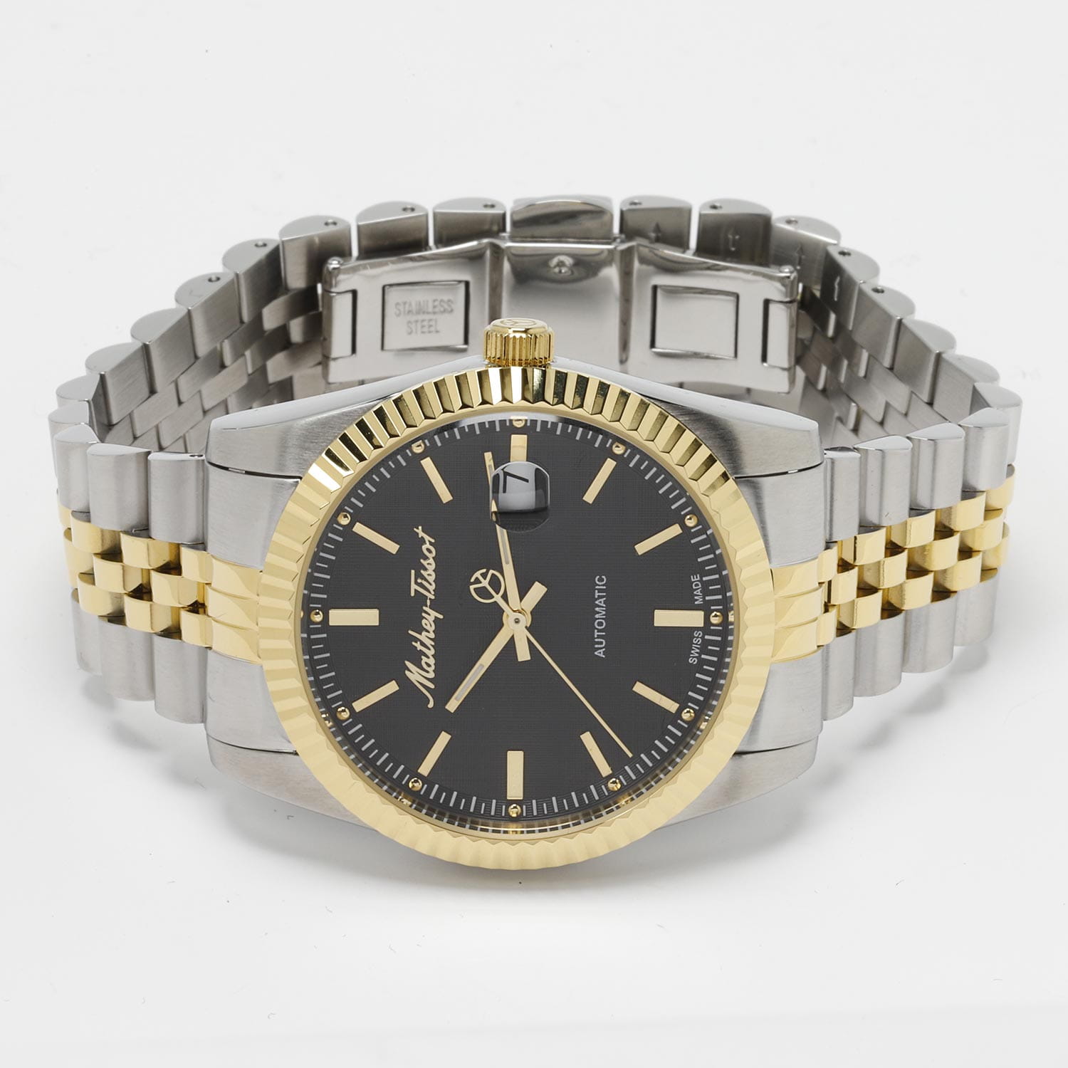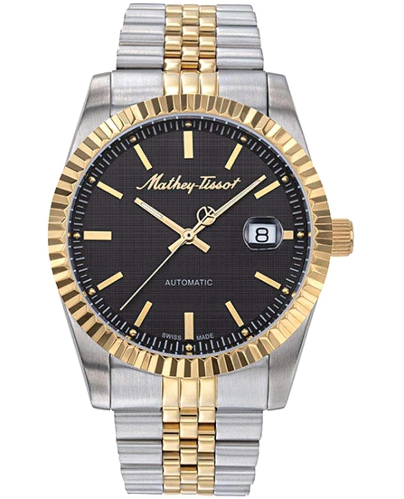 Мужские механические часы с автоподзаводом Mathey-Tissot Mathy H1810ATBN — это стильное сочетание элегантности и современного дизайна. Изящный корпус выполнен из нержавеющей стали, диаметром 42 мм, что придаст образу элегантности и надежности. Изысканный циферблат с метками в виде штрихов придает модели особый блеск. Циферблат защищен минеральным стекломМинеральное стеклоМинеральное стекло представляет собой искусственно выращенный минерал кварца. Такое стекло отличается особой устойчивостью к повреждениям и царапинам. Уступает по некоторым качествам сапфировому стеклу. с сапфировым покрытием, обеспечивает устойчивость к царапинам. БезельБезельВнешний ободок, закрепляющий стекло. В спортивных часах так называется поворотное кольцо с делениями на циферблате, выполняет роль таймера – замеряет отрезки времени на шкале. Неподвижный безель – элемент декора. Однонаправленно вращающийся безель на дайверских часах позволяет фиксировать моменты погружения и выныривания на поверхность. с PVD-покрытиемPVDУльтратонкое покрытие наносится в технике вакуумного напыления, сочетает в себе нитрид титана особой прочности со слоем золота или оксида хрома. Несёт в себе декоративную или защитную функцию. золотистого цвета. Стрелки и метки с люминесцентным покрытиемЛюминесцентное покрытиеПозволяет считывать показания времени в темноте. Производители наносят на стрелки, часовые индексы, безель или поверхность циферблата светонакопительный состав, дающий холодное свечение.. Окошко даты находится в положении 3 часа. Стальной браслет с частичным PVD-покрытиемPVDУльтратонкое покрытие наносится в технике вакуумного напыления, сочетает в себе нитрид титана особой прочности со слоем золота или оксида хрома. Несёт в себе декоративную или защитную функцию. на застёжке-бабочке с кнопкамиЗастёжка "бабочка"Такой вид застёжки дополняется предохранителями, помогающими избежать случайного раскрытия браслета. Обладают изящным исполнением. , гарантирует комфортное и безопасное ношение. Рифленая заводная головка. Класс водозащиты: 50 метров позволит защитить корпус от случайных брызг или капель дождя. Mathey-Tissot  — отличный выбор для тех, кто ценит утонченность и качество.