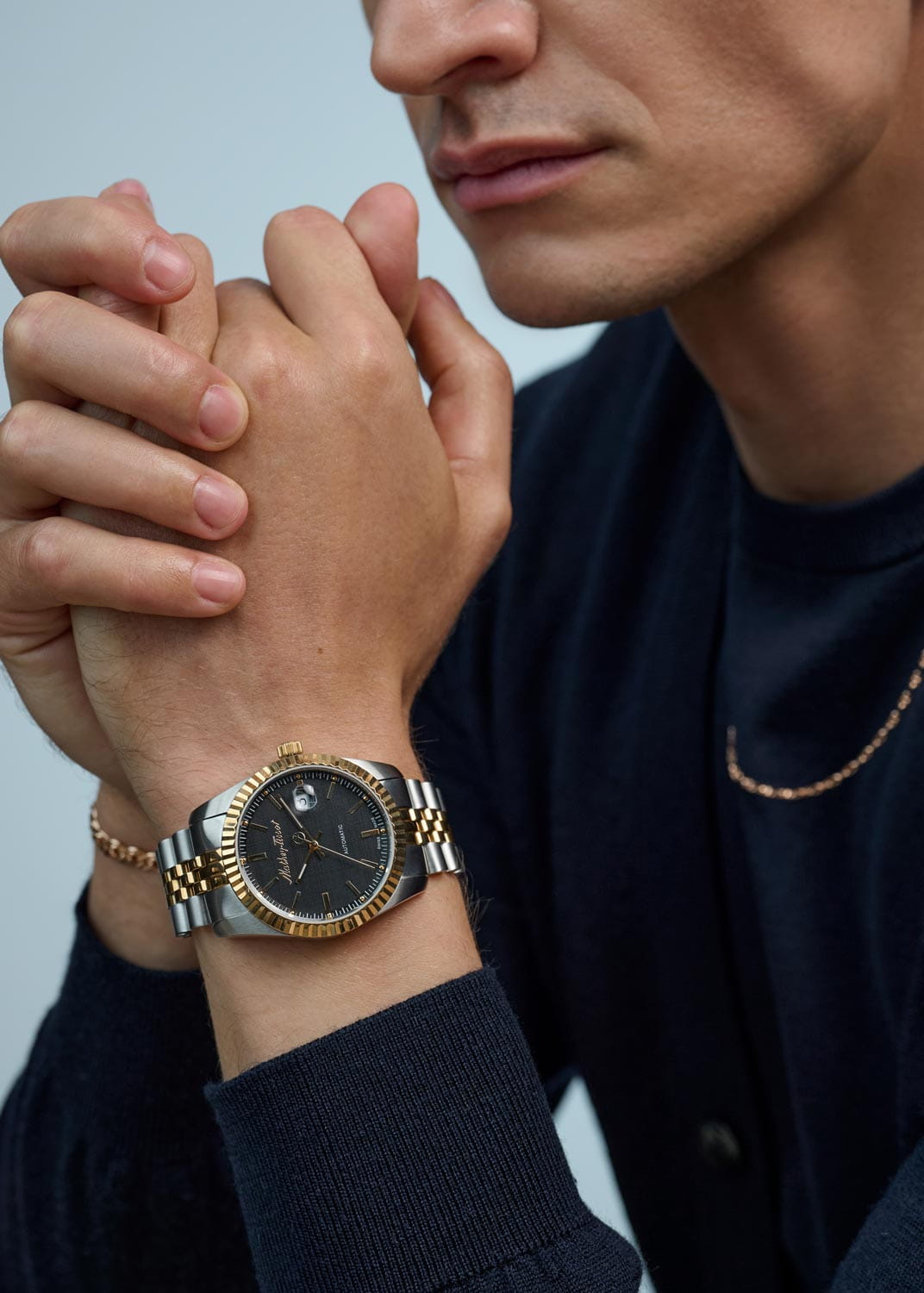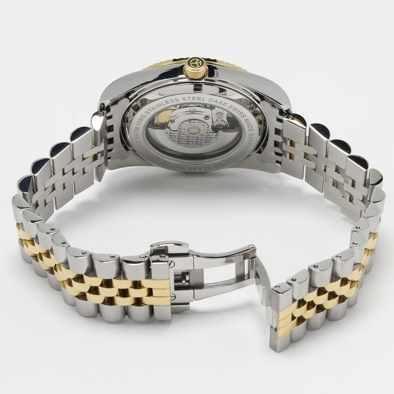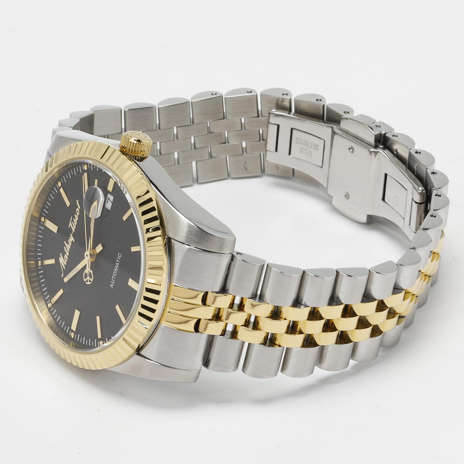 Мужские механические часы с автоподзаводом Mathey-Tissot Mathy H1810ATBN — это стильное сочетание элегантности и современного дизайна. Изящный корпус выполнен из нержавеющей стали, диаметром 42 мм, что придаст образу элегантности и надежности. Изысканный циферблат с метками в виде штрихов придает модели особый блеск. Циферблат защищен минеральным стекломМинеральное стеклоМинеральное стекло представляет собой искусственно выращенный минерал кварца. Такое стекло отличается особой устойчивостью к повреждениям и царапинам. Уступает по некоторым качествам сапфировому стеклу. с сапфировым покрытием, обеспечивает устойчивость к царапинам. БезельБезельВнешний ободок, закрепляющий стекло. В спортивных часах так называется поворотное кольцо с делениями на циферблате, выполняет роль таймера – замеряет отрезки времени на шкале. Неподвижный безель – элемент декора. Однонаправленно вращающийся безель на дайверских часах позволяет фиксировать моменты погружения и выныривания на поверхность. с PVD-покрытиемPVDУльтратонкое покрытие наносится в технике вакуумного напыления, сочетает в себе нитрид титана особой прочности со слоем золота или оксида хрома. Несёт в себе декоративную или защитную функцию. золотистого цвета. Стрелки и метки с люминесцентным покрытиемЛюминесцентное покрытиеПозволяет считывать показания времени в темноте. Производители наносят на стрелки, часовые индексы, безель или поверхность циферблата светонакопительный состав, дающий холодное свечение.. Окошко даты находится в положении 3 часа. Стальной браслет с частичным PVD-покрытиемPVDУльтратонкое покрытие наносится в технике вакуумного напыления, сочетает в себе нитрид титана особой прочности со слоем золота или оксида хрома. Несёт в себе декоративную или защитную функцию. на застёжке-бабочке с кнопкамиЗастёжка "бабочка"Такой вид застёжки дополняется предохранителями, помогающими избежать случайного раскрытия браслета. Обладают изящным исполнением. , гарантирует комфортное и безопасное ношение. Рифленая заводная головка. Класс водозащиты: 50 метров позволит защитить корпус от случайных брызг или капель дождя. Mathey-Tissot  — отличный выбор для тех, кто ценит утонченность и качество.