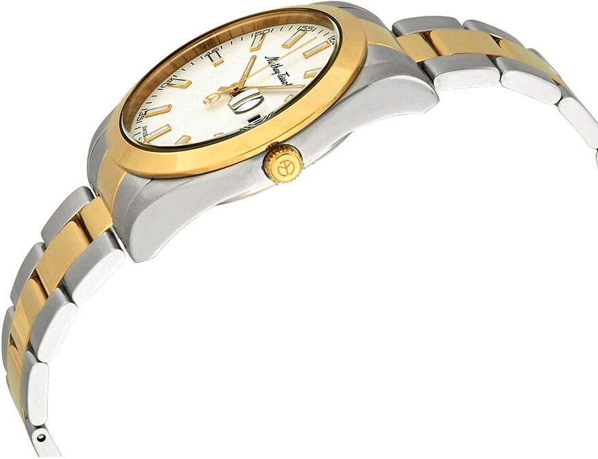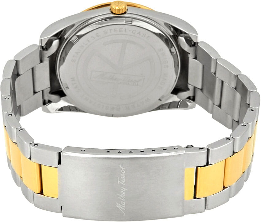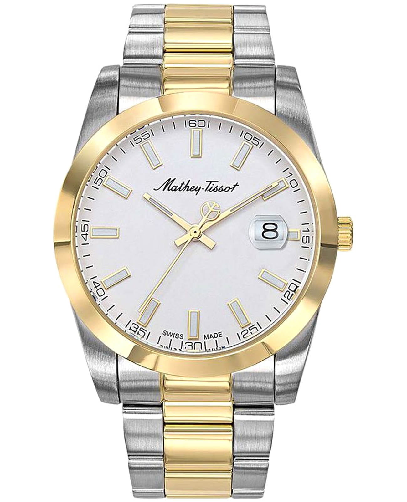 Мужские кварцевые часы Mathey-Tissot Mathy H450BI — это стильное сочетание элегантности и современного дизайна. Изящный корпус выполнен из нержавеющей стали, диаметром 40 мм, что придаст образу элегантности и надежности. Изысканный циферблат с метками в виде штрихов придает модели особый блеск. Циферблат защищен минеральным стекломМинеральное стеклоМинеральное стекло представляет собой искусственно выращенный минерал кварца. Такое стекло отличается особой устойчивостью к повреждениям и царапинам. Уступает по некоторым качествам сапфировому стеклу., обеспечивает устойчивость к царапинам. Стрелки с люминесцентным покрытиемЛюминесцентное покрытиеПозволяет считывать показания времени в темноте. Производители наносят на стрелки, часовые индексы, безель или поверхность циферблата светонакопительный состав, дающий холодное свечение.. БезельБезельВнешний ободок, закрепляющий стекло. В спортивных часах так называется поворотное кольцо с делениями на циферблате, выполняет роль таймера – замеряет отрезки времени на шкале. Неподвижный безель – элемент декора. Однонаправленно вращающийся безель на дайверских часах позволяет фиксировать моменты погружения и выныривания на поверхность. с PVD-покрытиемPVDУльтратонкое покрытие наносится в технике вакуумного напыления, сочетает в себе нитрид титана особой прочности со слоем золота или оксида хрома. Несёт в себе декоративную или защитную функцию. золотистого цвета. Окошко даты находится в положении 3 часа. Часы оснащены надежным кварцевым механизмом. Стальной браслет с частичным PVD-покрытиемPVDУльтратонкое покрытие наносится в технике вакуумного напыления, сочетает в себе нитрид титана особой прочности со слоем золота или оксида хрома. Несёт в себе декоративную или защитную функцию. на раскладной застёжке с фиксаторомРаскладная застёжкаТакой тип застёжки используется только на браслетах из металла. Она никогда не раскрывается полностью, происходит разделение на 2 и более частей. Раскладывающая застёжка снизит вероятность потери часов к минимуму., гарантирует комфортное и безопасное ношение. Рифленая заводная головка. Класс водозащиты: 50 метров позволит защитить корпус от случайных брызг или капель дождя. Mathey-Tissot  — отличный выбор для тех, кто ценит утонченность и качество.
