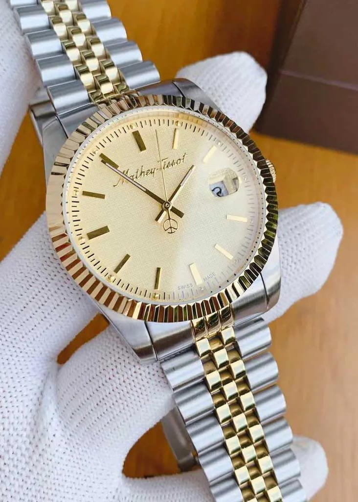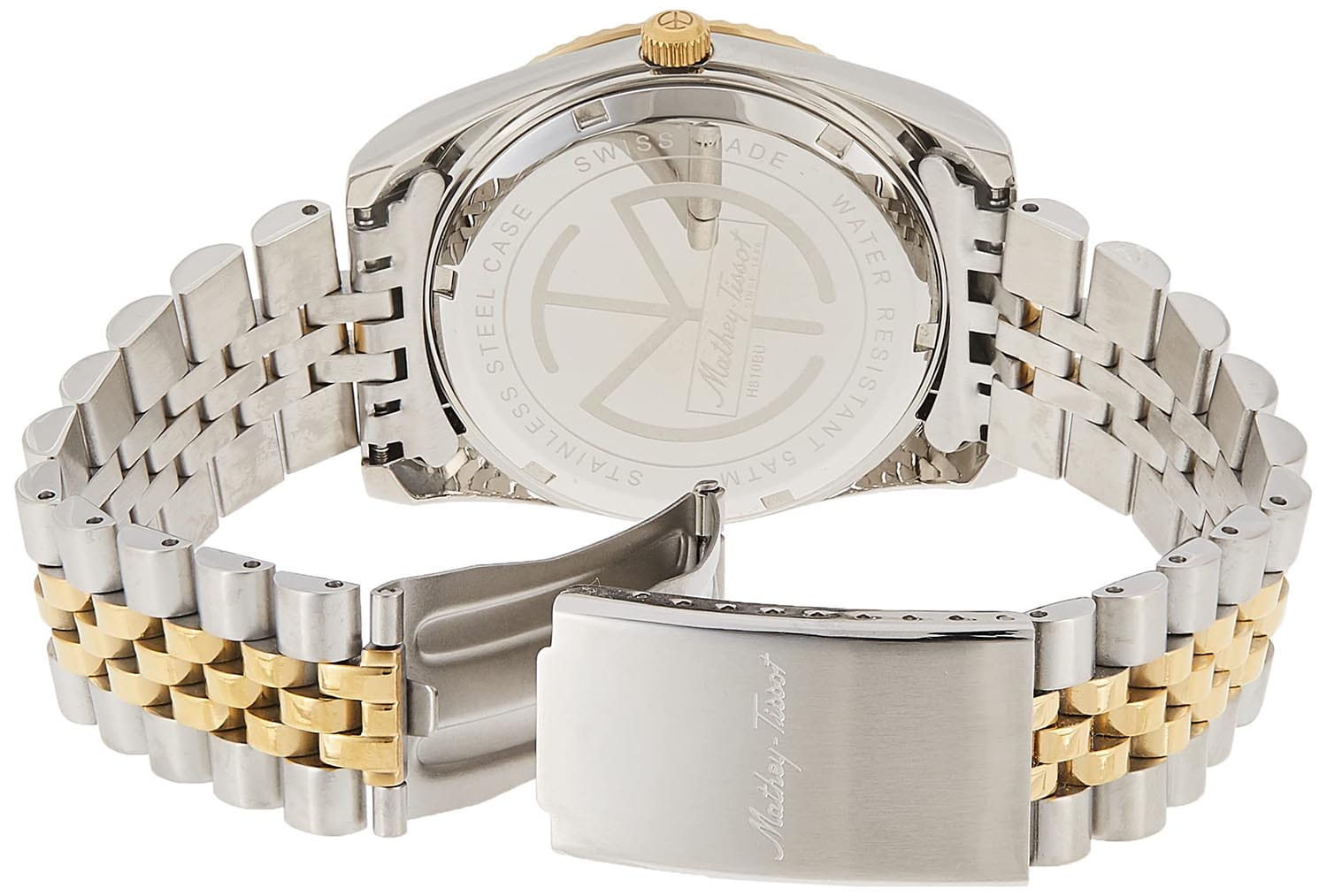 Мужские кварцевые часы Mathey-Tissot Mathy H810BDI — это стильное сочетание элегантности и современного дизайна. Изящный корпус выполнен из нержавеющей стали, диаметром 40 мм, что придаст образу элегантности и надежности. Изысканный циферблат с метками в виде штрихов придает модели особый блеск. Циферблат защищен минеральным стекломМинеральное стеклоМинеральное стекло представляет собой искусственно выращенный минерал кварца. Такое стекло отличается особой устойчивостью к повреждениям и царапинам. Уступает по некоторым качествам сапфировому стеклу., обеспечивает устойчивость к царапинам. Стрелки с люминесцентным покрытиемЛюминесцентное покрытиеПозволяет считывать показания времени в темноте. Производители наносят на стрелки, часовые индексы, безель или поверхность циферблата светонакопительный состав, дающий холодное свечение. SuperLumiNova, которое светится в темноте после непродолжительной зарядки на свету. БезельБезельВнешний ободок, закрепляющий стекло. В спортивных часах так называется поворотное кольцо с делениями на циферблате, выполняет роль таймера – замеряет отрезки времени на шкале. Неподвижный безель – элемент декора. Однонаправленно вращающийся безель на дайверских часах позволяет фиксировать моменты погружения и выныривания на поверхность. с PVD-покрытиемPVDУльтратонкое покрытие наносится в технике вакуумного напыления, сочетает в себе нитрид титана особой прочности со слоем золота или оксида хрома. Несёт в себе декоративную или защитную функцию. золотистого цвета. Окошко даты находится в положении 3 часа. Часы оснащены надежным кварцевым механизмом. Стальной браслет с частичным PVD-покрытиемPVDУльтратонкое покрытие наносится в технике вакуумного напыления, сочетает в себе нитрид титана особой прочности со слоем золота или оксида хрома. Несёт в себе декоративную или защитную функцию. на раскладной застёжке с фиксаторомРаскладная застёжкаТакой тип застёжки используется только на браслетах из металла. Она никогда не раскрывается полностью, происходит разделение на 2 и более частей. Раскладывающая застёжка снизит вероятность потери часов к минимуму., гарантирует комфортное и безопасное ношение. Рифленая заводная головка. Класс водозащиты: 50 метров позволит защитить корпус от случайных брызг или капель дождя. Mathey-Tissot  — отличный выбор для тех, кто ценит утонченность и качество.