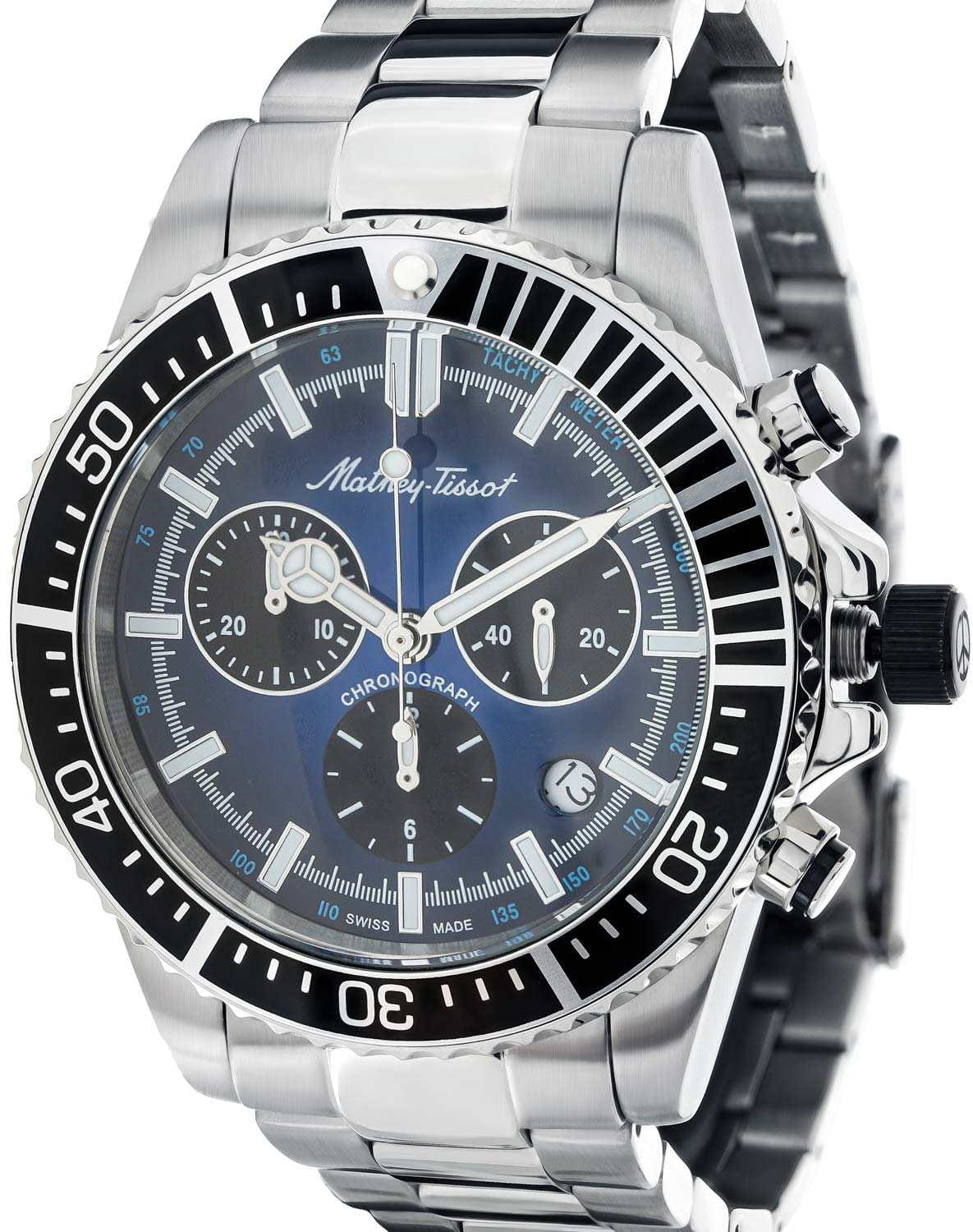 Мужские кварцевые часы-хронографХронографФункция позволяет измерять отрезки времени с особой точностью: часы, минуты, секунды. Верным признаком хронографа является наличие на циферблате 3 дополнительных окошек-счётчиков. с секундомеромСекундомерСекундоме́р — прибор, способный измерять интервалы времени с точностью до долей секунды. Mathey-Tissot Mathy H908CHABU — это стильное сочетание элегантности и современного дизайна. Лимитированная серия. Изящный корпус выполнен из нержавеющей стали, диаметром 42 мм, что придаст образу элегантности и надежности. Изысканный циферблат с метками в виде штрихов придает модели особый блеск. Циферблат защищен минеральным стекломМинеральное стеклоМинеральное стекло представляет собой искусственно выращенный минерал кварца. Такое стекло отличается особой устойчивостью к повреждениям и царапинам. Уступает по некоторым качествам сапфировому стеклу. с сапфировым покрытием, обеспечивает устойчивость к царапинам. Стрелки и метки с люминесцентным покрытиемЛюминесцентное покрытиеПозволяет считывать показания времени в темноте. Производители наносят на стрелки, часовые индексы, безель или поверхность циферблата светонакопительный состав, дающий холодное свечение.. БезельБезельВнешний ободок, закрепляющий стекло. В спортивных часах так называется поворотное кольцо с делениями на циферблате, выполняет роль таймера – замеряет отрезки времени на шкале. Неподвижный безель – элемент декора. Однонаправленно вращающийся безель на дайверских часах позволяет фиксировать моменты погружения и выныривания на поверхность. с PVD-покрытиемPVDУльтратонкое покрытие наносится в технике вакуумного напыления, сочетает в себе нитрид титана особой прочности со слоем золота или оксида хрома. Несёт в себе декоративную или защитную функцию.. Окошко даты находится в положении между 4 и 5 часов. Стальной браслет на раскладной застёжке с фиксаторомРаскладная застёжкаТакой тип застёжки используется только на браслетах из металла. Она никогда не раскрывается полностью, происходит разделение на 2 и более частей. Раскладывающая застёжка снизит вероятность потери часов к минимуму., гарантирует комфортное и безопасное ношение. Рифленая заводная головка. Класс водозащиты: 100 метров позволит плавать, нырять и заниматься другими водными видами спорта. Mathey-Tissot  — отличный выбор для тех, кто ценит утонченность и качество.