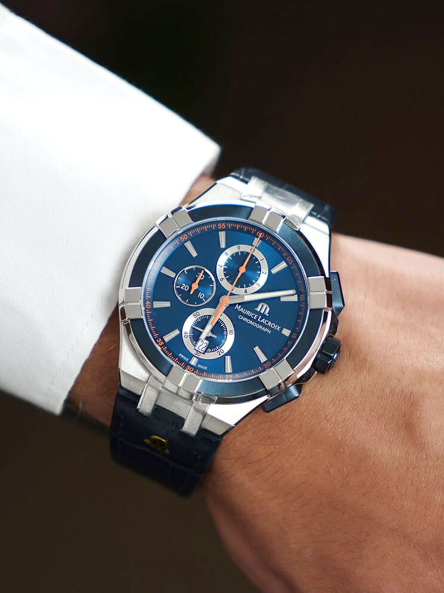 Мужские швейцарские кварцевые часы-хронографХронографФункция позволяет измерять отрезки времени с особой точностью: часы, минуты, секунды. Верным признаком хронографа является наличие на циферблате 3 дополнительных окошек-счётчиков. Maurice Lacroix Aikon Chronograph AI1018-SS001-432-4. Сапфировое стеклоСапфировое стеклоПрочный и надёжный материал из кристалла сапфира синтетического происхождения, характеризующийся особой твёрдостью и устойчивостью к царапинам и повреждениям. устойчивое к появлению царапин, обладающее высокой прозрачностью. Циферблат выполнен по технологии Sunray (солнечные лучи). Стрелки с люминесцентным покрытиемЛюминесцентное покрытиеПозволяет считывать показания времени в темноте. Производители наносят на стрелки, часовые индексы, безель или поверхность циферблата светонакопительный состав, дающий холодное свечение.. Класс водозащиты: 100 метров, позволит плавать, нырять и заниматься другими водными видами спорта. Окошко даты находится в положении 6 часов. Корпус часов изготовлен из стали с PVD-покрытиемPVDУльтратонкое покрытие наносится в технике вакуумного напыления, сочетает в себе нитрид титана особой прочности со слоем золота или оксида хрома. Несёт в себе декоративную или защитную функцию.. Кожаный ремешок с застёжкой «бабочка» с кнопкамиЗастёжка "бабочка"Такой вид застёжки дополняется предохранителями, помогающими избежать случайного раскрытия браслета. Обладают изящным исполнением. .