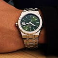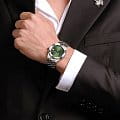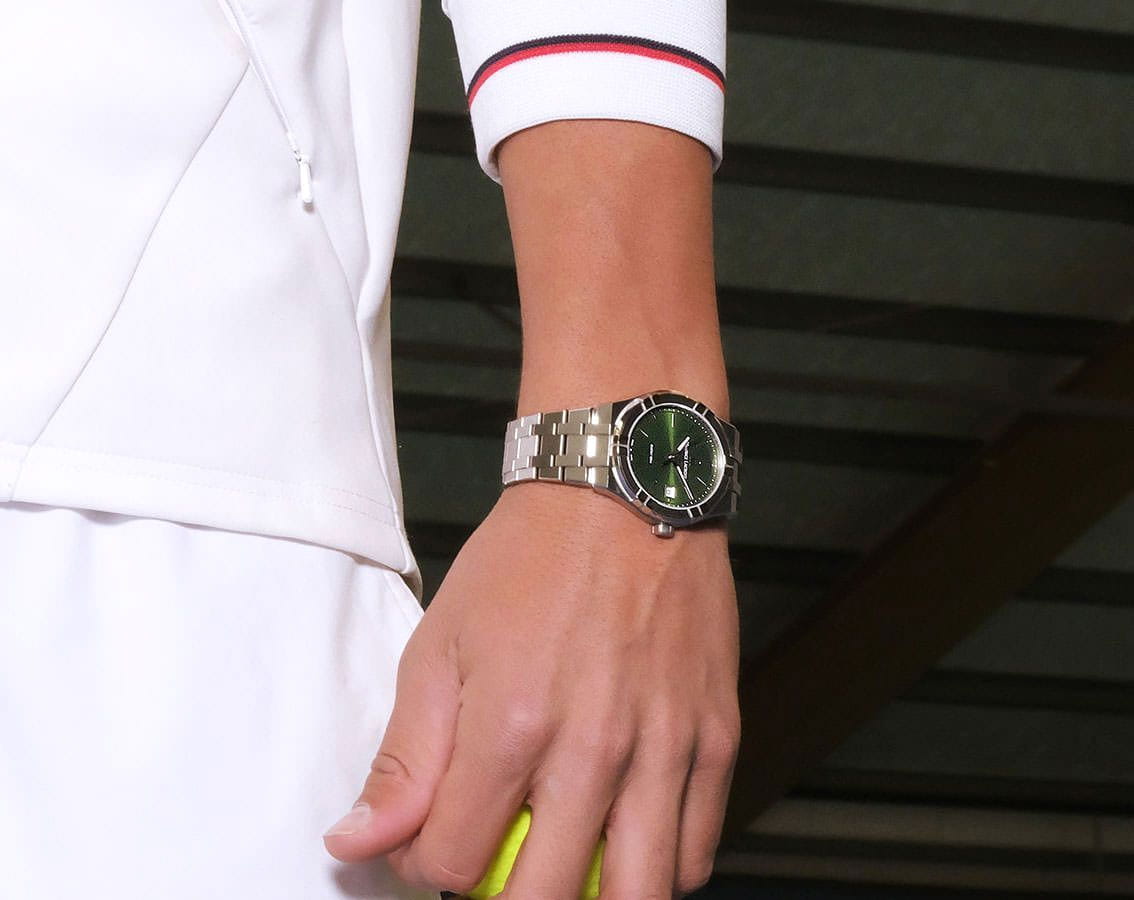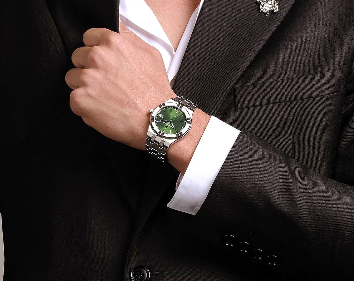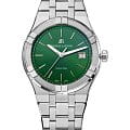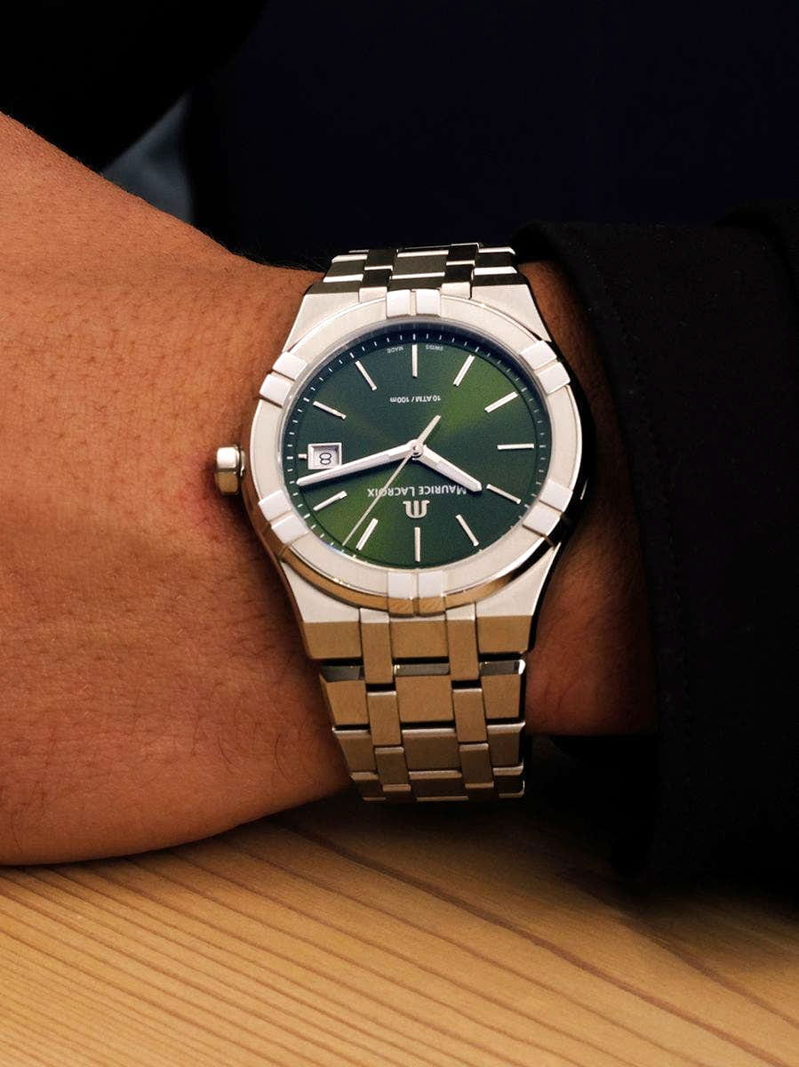 Мужские швейцарские кварцевые часы Maurice Lacroix Aikon Quartz AI1108-SS002-630-1. Сапфировое стеклоСапфировое стеклоПрочный и надёжный материал из кристалла сапфира синтетического происхождения, характеризующийся особой твёрдостью и устойчивостью к царапинам и повреждениям. устойчивое к появлению царапин, обладающее высокой прозрачностью. Зеленый циферблат. Стрелки с люминесцентным покрытиемЛюминесцентное покрытиеПозволяет считывать показания времени в темноте. Производители наносят на стрелки, часовые индексы, безель или поверхность циферблата светонакопительный состав, дающий холодное свечение.. Класс водозащиты: 100 метров, позволит плавать, нырять и заниматься другими водными видами спорта. Окошко даты находится в положении 3 часов. Корпус и браслет часов изготовлены из стали. Браслет с застёжкой «бабочка» с кнопкамиЗастёжка "бабочка"Такой вид застёжки дополняется предохранителями, помогающими избежать случайного раскрытия браслета. Обладают изящным исполнением. .