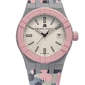 Увековечивая историю #tide, эта новая модель снова изготовлена из переработанного пластика, связанного океаном. Он оснащен черным циферблатом и соответствующим 40-миллиметровым корпусом. БезельБезельВнешний ободок, закрепляющий стекло. В спортивных часах так называется поворотное кольцо с делениями на циферблате, выполняет роль таймера – замеряет отрезки времени на шкале. Неподвижный безель – элемент декора. Однонаправленно вращающийся безель на дайверских часах позволяет фиксировать моменты погружения и выныривания на поверхность. выполнен в розовом цвете, а на камуфляжном силиконовом ремешке красуется логотип Maurice Lacroix в виде буквы "М", также выполненный в камуфляжном оттенке.
