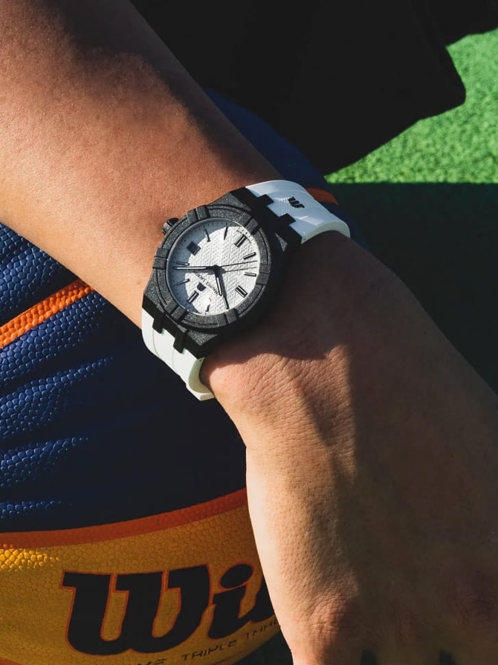 Новое специальное издание AIKON #tide FIBA3x3, наполненное энергией. Эти часы с баскетбольной тематикой, помещенные в 40-миллиметровый корпус, оснащены плоским сапфировым стеклом, улучшающим читаемость, а кварцевый механизм обеспечивает точность в мире, где секунды на счету. Эти две модели, идеально подходящие для придворных, выпускаются с черными или белыми циферблатами и поставляются на координирующих ремешках. На циферблатах нанесен логотип "3x3", выполненный в виде замысловатого мотива, а на задней крышке корпуса также выбит логотип ‘3x3’. Мужские швейцарские кварцевые часы Maurice Lacroix Aikon Tide Special Edition FIBA 3x3 AI2008-00YZ1-000-0. Сапфировое стеклоСапфировое стеклоПрочный и надёжный материал из кристалла сапфира синтетического происхождения, характеризующийся особой твёрдостью и устойчивостью к царапинам и повреждениям. устойчивое к появлению царапин, обладающее высокой прозрачностью. Белый циферблат. Стрелки и метки с люминесцентным покрытиемЛюминесцентное покрытиеПозволяет считывать показания времени в темноте. Производители наносят на стрелки, часовые индексы, безель или поверхность циферблата светонакопительный состав, дающий холодное свечение.. Класс водозащиты: 100 метров, позволит плавать, нырять и заниматься другими водными видами спорта. Окошко даты находится в положении 3 часов. Корпус выполнен из переработанного пластика, ранее загрязнявшего Мировой океан. Каучуковый ремешок с классической застежкой.