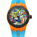 В модели AIKON #tide Benzilla яркость цвета – на максимуме! Эти часы созданы в корпусе из материала #tide диаметром 40 мм и традиционно для коллекции снабжены швейцарским кварцевым механизмом. Но не это главное! Первую скрипку в этих часах играет цвет, а циферблат украшает потрясающе яркая работа Бензиллы. На циферблате разместился частый герой произведений тайского художника, трехглазый фантастический персонаж по имени «LOOOK», любопытный пришелец из ниоткуда, живущий среди людей. БезельБезельВнешний ободок, закрепляющий стекло. В спортивных часах так называется поворотное кольцо с делениями на циферблате, выполняет роль таймера – замеряет отрезки времени на шкале. Неподвижный безель – элемент декора. Однонаправленно вращающийся безель на дайверских часах позволяет фиксировать моменты погружения и выныривания на поверхность. и заводная головка выполнены в черном цвете, а сам корпус – в ярко-оранжевом. Светло-голубой каучуковый ремешок завершает ансамбль. Владельцы часов смогут менять ремешки один на другой без использования инструментов благодаря системе Easy Strap Exchange. Мужские швейцарские кварцевые часы Maurice Lacroix Aikon Quartz AI2008-50YZA-000-0. Сапфировое стеклоСапфировое стеклоПрочный и надёжный материал из кристалла сапфира синтетического происхождения, характеризующийся особой твёрдостью и устойчивостью к царапинам и повреждениям. устойчивое к появлению царапин, обладающее высокой прозрачностью. Оранжевый циферблат. Стрелки и метки с люминесцентным покрытиемЛюминесцентное покрытиеПозволяет считывать показания времени в темноте. Производители наносят на стрелки, часовые индексы, безель или поверхность циферблата светонакопительный состав, дающий холодное свечение.. Класс водозащиты: 100 метров, позволит плавать, нырять и заниматься другими водными видами спорта. Окошко даты находится в положении 3 часов. Корпус выполнен из переработанного пластика, ранее загрязнявшего Мировой океан. Каучуковый ремешок с классической застежкой.