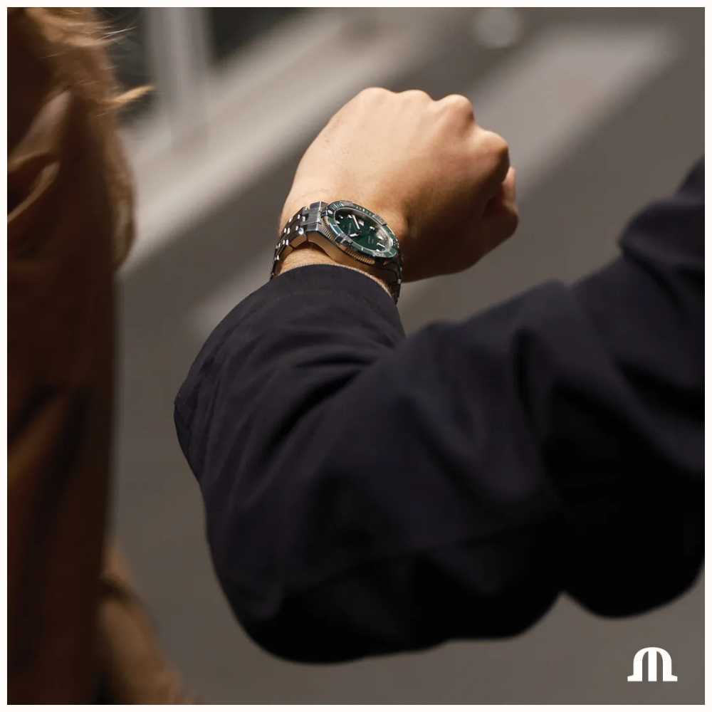 Механический механизм (автоматический калибр) с высокой точностью. Сапфировое стеклоСапфировое стеклоПрочный и надёжный материал из кристалла сапфира синтетического происхождения, характеризующийся особой твёрдостью и устойчивостью к царапинам и повреждениям. с антибликовым покрытием устойчивое к появлению царапин, обладающее высокой прозрачностью. Стрелки с люминесцентным покрытиемЛюминесцентное покрытиеПозволяет считывать показания времени в темноте. Производители наносят на стрелки, часовые индексы, безель или поверхность циферблата светонакопительный состав, дающий холодное свечение.. Поворотный безельБезельВнешний ободок, закрепляющий стекло. В спортивных часах так называется поворотное кольцо с делениями на циферблате, выполняет роль таймера – замеряет отрезки времени на шкале. Неподвижный безель – элемент декора. Однонаправленно вращающийся безель на дайверских часах позволяет фиксировать моменты погружения и выныривания на поверхность. с PVD-покрытиемPVDУльтратонкое покрытие наносится в технике вакуумного напыления, сочетает в себе нитрид титана особой прочности со слоем золота или оксида хрома. Несёт в себе декоративную или защитную функцию.. Класс водозащиты: 300 метров, позволит плавать, нырять и заниматься другими водными видами спорта. Корпус часов изготовлен из нержавеющей стали. Браслет с застёжкой «бабочка» с кнопкамиЗастёжка "бабочка"Такой вид застёжки дополняется предохранителями, помогающими избежать случайного раскрытия браслета. Обладают изящным исполнением. .