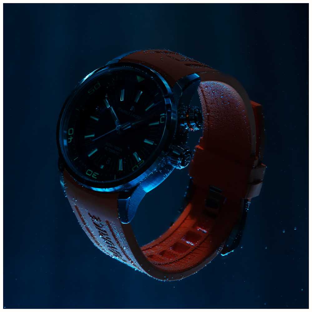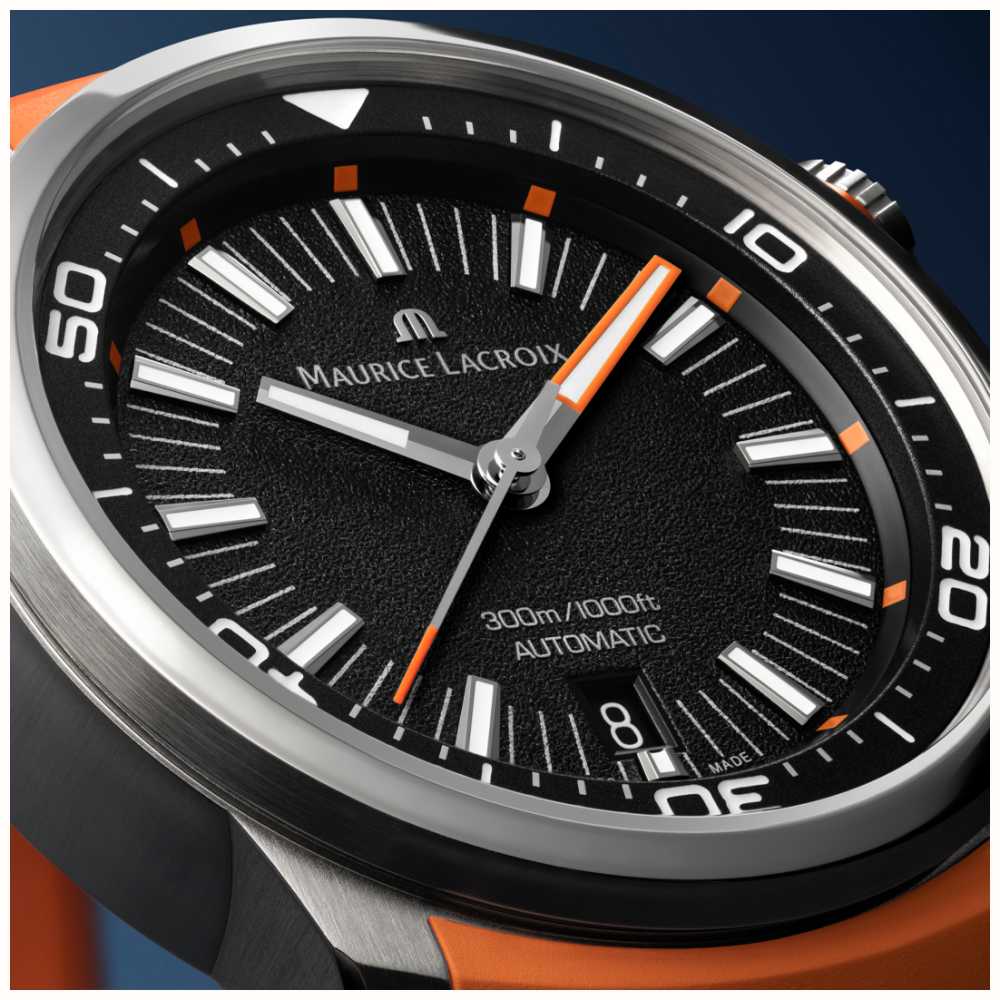 Мужские швейцарские часы Maurice Lacroix Pontos S Diver PT6248-SS00L-330-J, механический механизм (автоматический калибр) с высокой точностью. Сапфировое стеклоСапфировое стеклоПрочный и надёжный материал из кристалла сапфира синтетического происхождения, характеризующийся особой твёрдостью и устойчивостью к царапинам и повреждениям. устойчивое к появлению царапин, обладающее высокой прозрачностью. Корпус изготовлен из нержавеющей стали. Стрелки с люминесцентным покрытиемЛюминесцентное покрытиеПозволяет считывать показания времени в темноте. Производители наносят на стрелки, часовые индексы, безель или поверхность циферблата светонакопительный состав, дающий холодное свечение..Класс водозащиты: 300 метров, позволит плавать, нырять и заниматься другими водными видами спорта. Стальной браслет на застёжке-бабочке с кнопкамиЗастёжка "бабочка"Такой вид застёжки дополняется предохранителями, помогающими избежать случайного раскрытия браслета. Обладают изящным исполнением. . Циферблат обрамляет черный внутренний безель. Каучуковый ремешок на стандартной застёжке.Черный циферблат с зернистой текстурой оснащен индексами в виде жезлов в серебряной оправе, а также серебряными часовой, минутной и секундной стрелками с оранжевыми деталями.