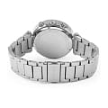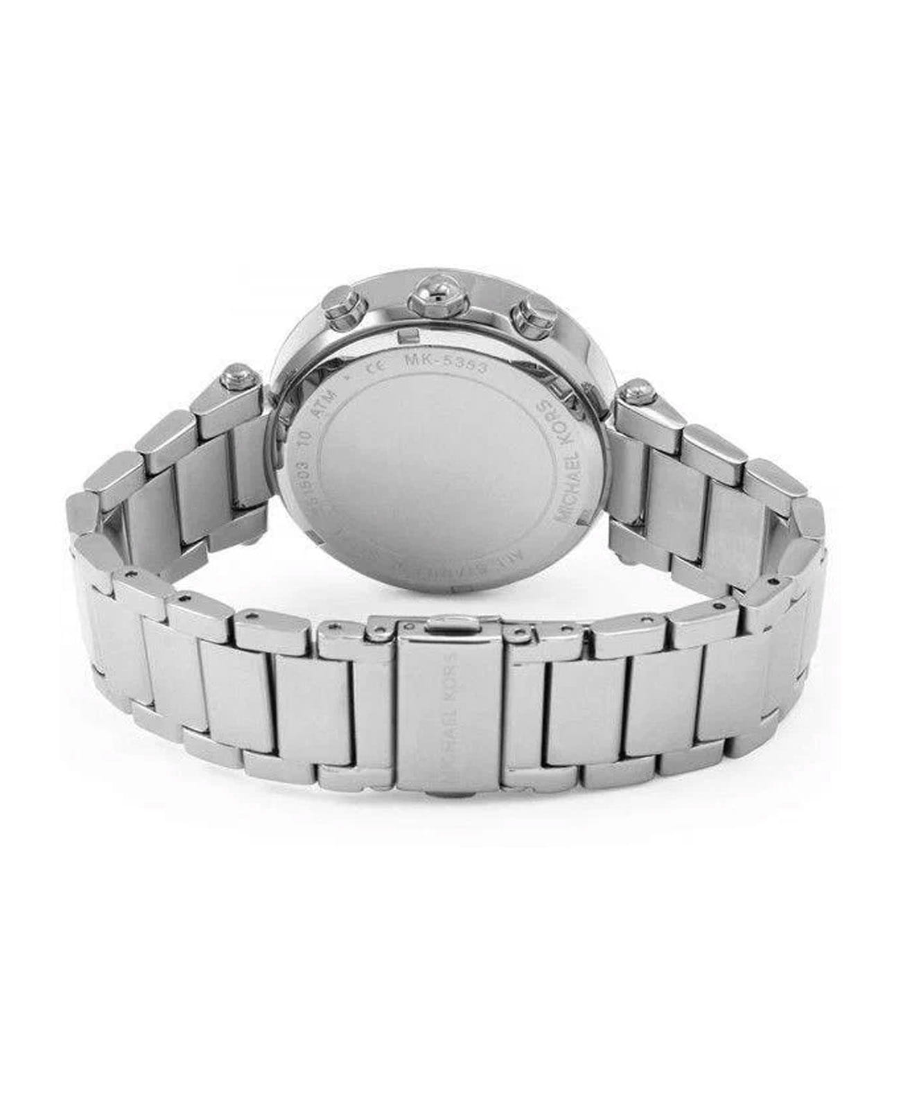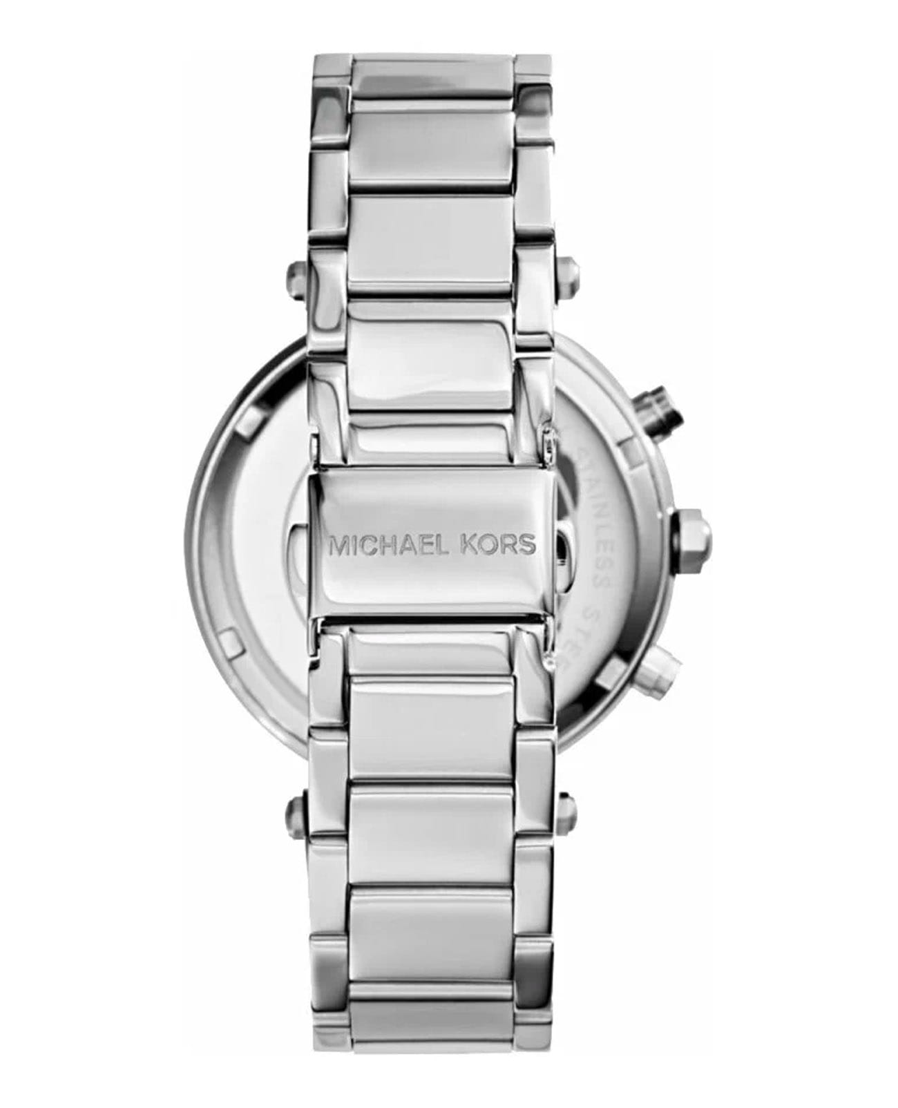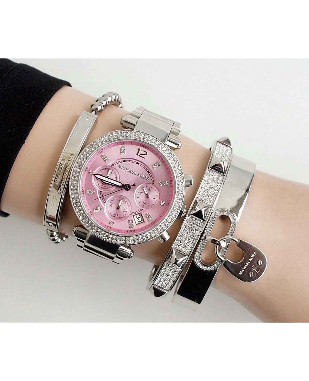 Женские американские часы- хронографХронографФункция позволяет измерять отрезки времени с особой точностью: часы, минуты, секунды. Верным признаком хронографа является наличие на циферблате 3 дополнительных окошек-счётчиков. Michael Kors Parker MK6105, кварцевый механизм с высокой точностью. Минеральное стеклоМинеральное стеклоМинеральное стекло представляет собой искусственно выращенный минерал кварца. Такое стекло отличается особой устойчивостью к повреждениям и царапинам. Уступает по некоторым качествам сапфировому стеклу., устойчивое к мелким механическим повреждениям. Корпус часов выполнен из нержавеющей стали. БезельБезельВнешний ободок, закрепляющий стекло. В спортивных часах так называется поворотное кольцо с делениями на циферблате, выполняет роль таймера – замеряет отрезки времени на шкале. Неподвижный безель – элемент декора. Однонаправленно вращающийся безель на дайверских часах позволяет фиксировать моменты погружения и выныривания на поверхность. и циферблат украшены кристаллами. Стрелки с люминесцентным покрытиемЛюминесцентное покрытиеПозволяет считывать показания времени в темноте. Производители наносят на стрелки, часовые индексы, безель или поверхность циферблата светонакопительный состав, дающий холодное свечение.. Окошко даты находится в положении между 4 и 5 часами. Класс водозащиты: 100 метров, позволит плавать, нырять и заниматься другими водными видами спорта. Стальной браслет на раскладной застёжкеРаскладная застёжкаТакой тип застёжки используется только на браслетах из металла. Она никогда не раскрывается полностью, происходит разделение на 2 и более частей. Раскладывающая застёжка снизит вероятность потери часов к минимуму..