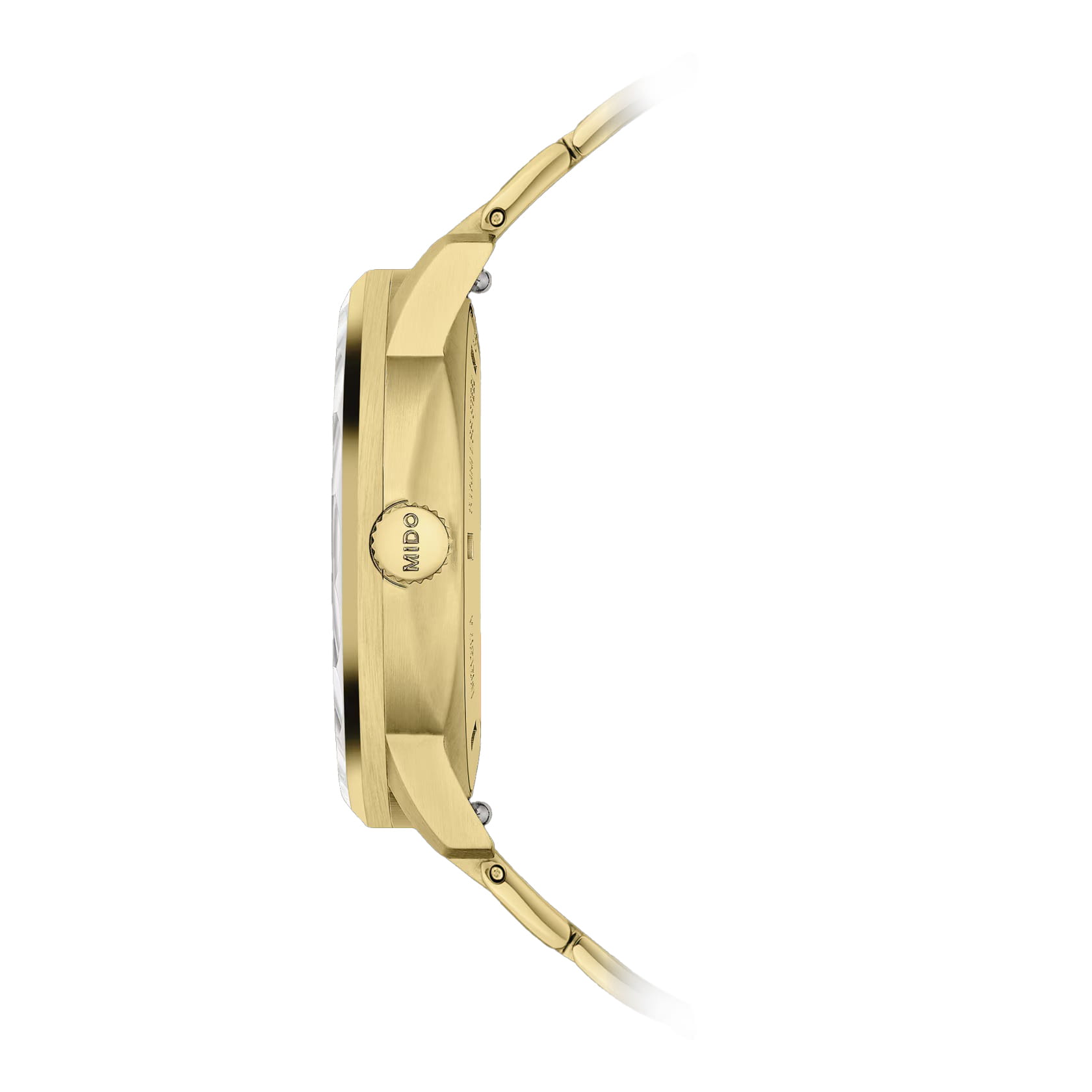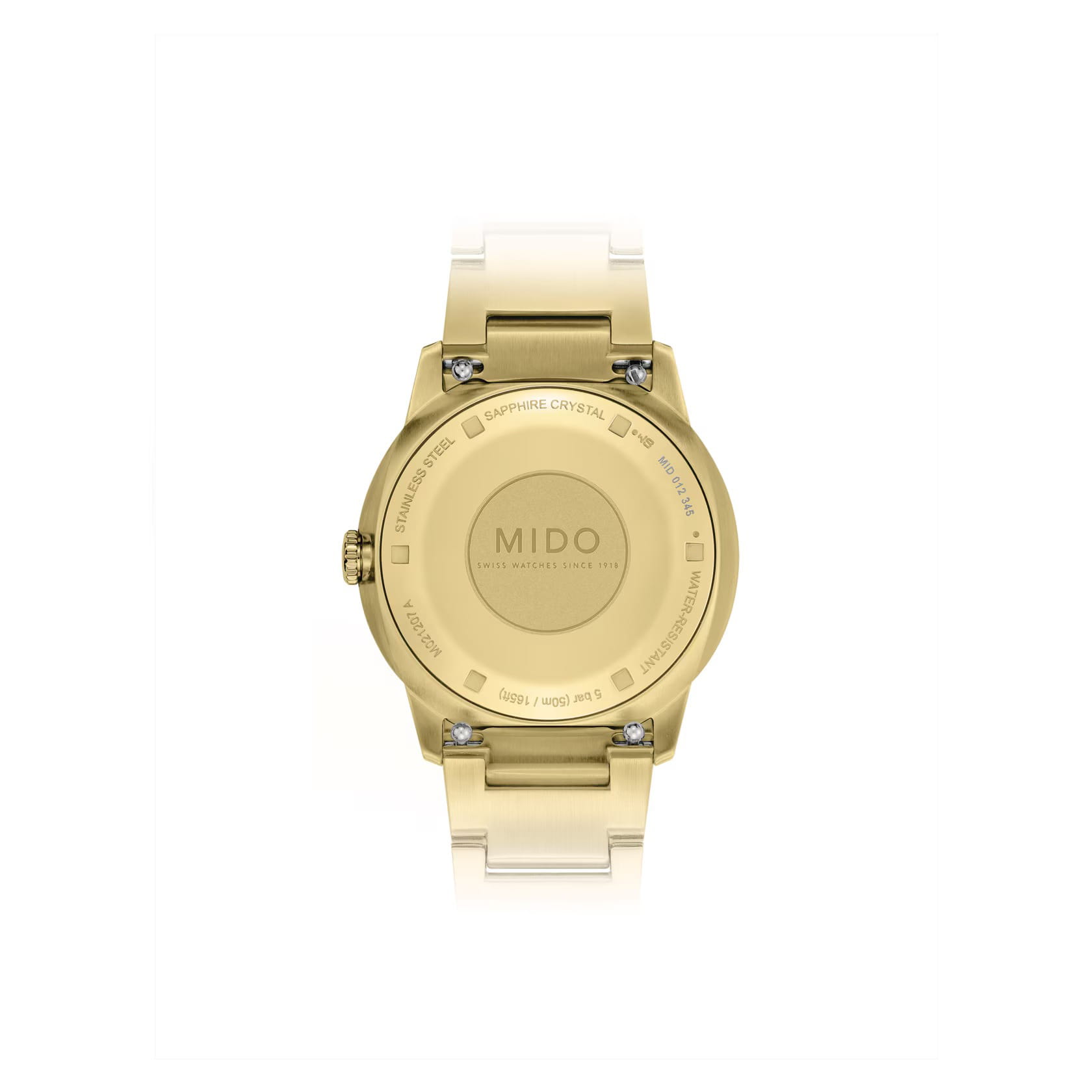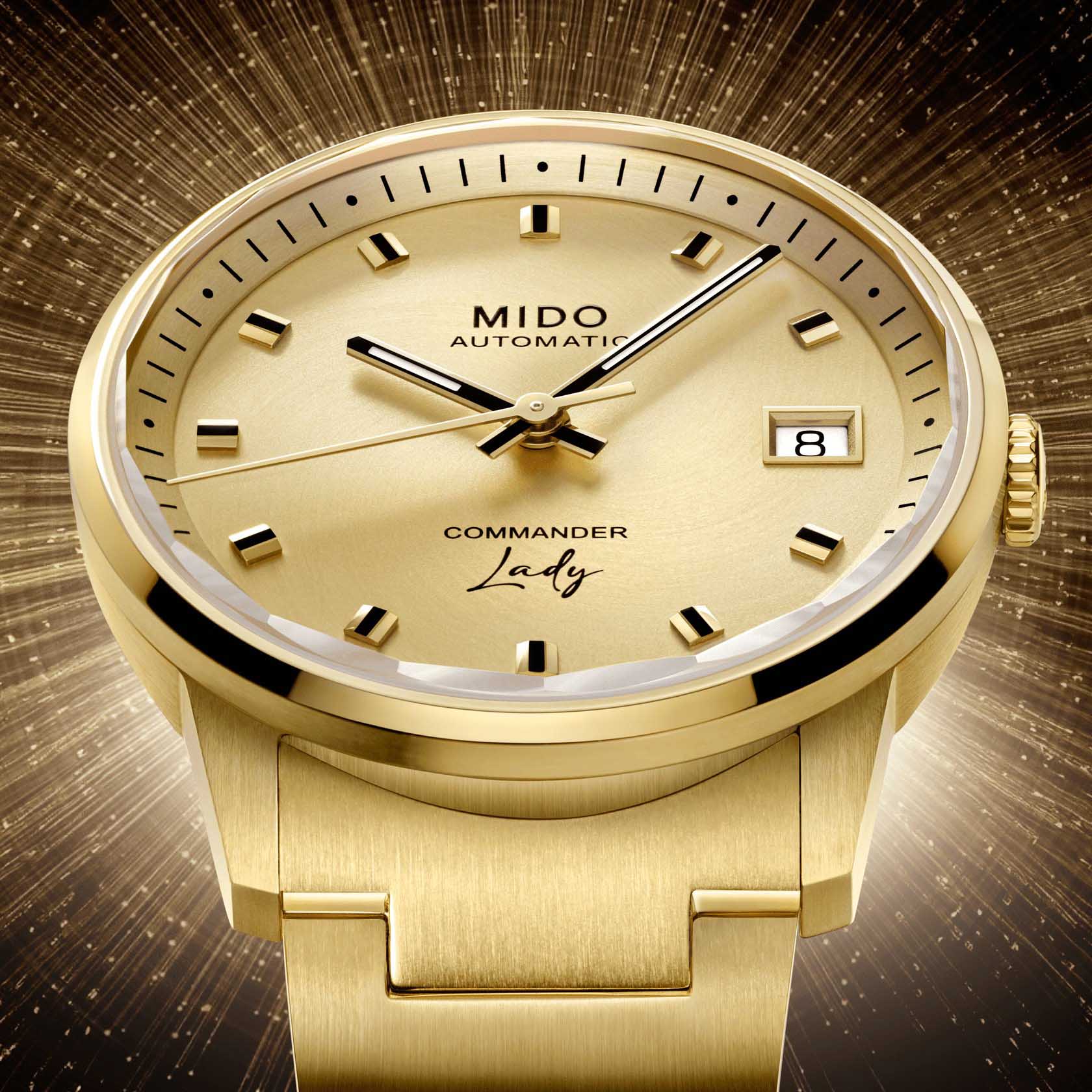 Изысканные и неброские, новые швейцарские механические часы для женщин Mido Commander Lady M021.207.33.051.00, механический механизм (автоматический калибр) с высокой точностью. Сапфировое стеклоСапфировое стеклоПрочный и надёжный материал из кристалла сапфира синтетического происхождения, характеризующийся особой твёрдостью и устойчивостью к царапинам и повреждениям. устойчивое к появлению царапин, обладающее высокой прозрачностью. Идеальный круглый корпус, открывающийся на циферблат, тонкий безель и неброская заводная головка, традиционные стрелки и индексы, превосходный швейцарский автоматический калибр с высокотехнологичной балансировочной пружиной: Commander поражает в этой женской версии. Стрелки с люминесцентным покрытиемЛюминесцентное покрытиеПозволяет считывать показания времени в темноте. Производители наносят на стрелки, часовые индексы, безель или поверхность циферблата светонакопительный состав, дающий холодное свечение.. Окошко даты в положении 3 часов. Класс водозащиты: 50 метров, позволит защитить корпус от случайных брызг или капель дождя. Стальной браслет с PVD-покрытиемPVDУльтратонкое покрытие наносится в технике вакуумного напыления, сочетает в себе нитрид титана особой прочности со слоем золота или оксида хрома. Несёт в себе декоративную или защитную функцию. на раскладной застёжкеРаскладная застёжкаТакой тип застёжки используется только на браслетах из металла. Она никогда не раскрывается полностью, происходит разделение на 2 и более частей. Раскладывающая застёжка снизит вероятность потери часов к минимуму..