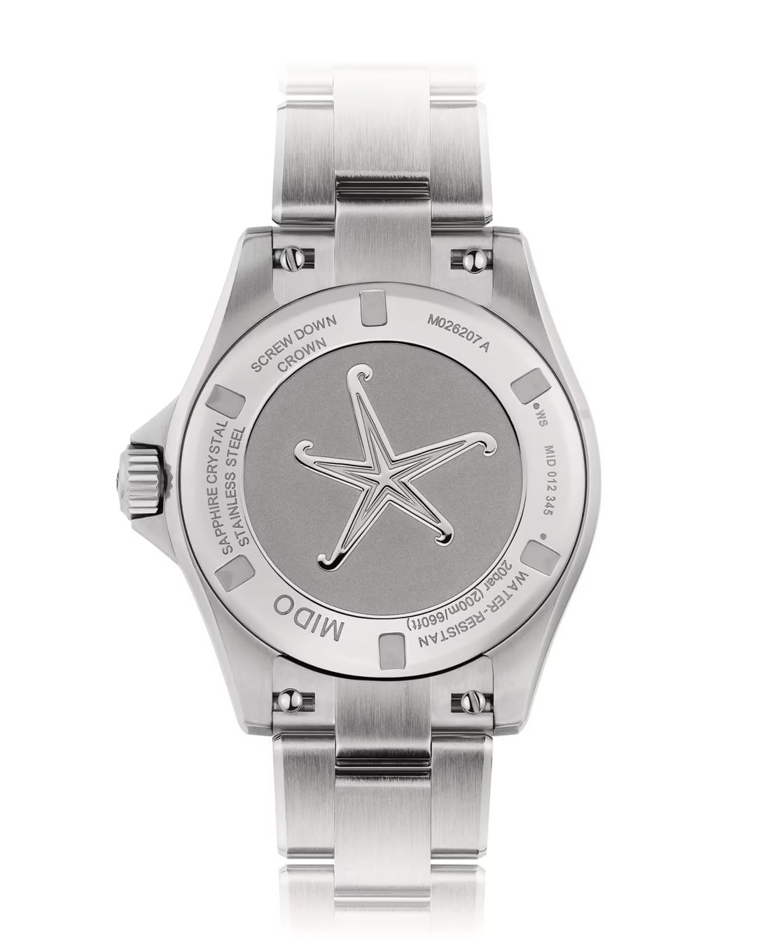 Женские швейцарские механические часы с сапфировым стеклом Mido Ocean Star 36.5 M026.207.11.041.00, механический механизм (автоматический калибр) с высокой точностью. Сапфировое стеклоСапфировое стеклоПрочный и надёжный материал из кристалла сапфира синтетического происхождения, характеризующийся особой твёрдостью и устойчивостью к царапинам и повреждениям. устойчивое к появлению царапин, обладающее высокой прозрачностью. Корпус часов изготовлен из стали. Вращающийся безельБезельВнешний ободок, закрепляющий стекло. В спортивных часах так называется поворотное кольцо с делениями на циферблате, выполняет роль таймера – замеряет отрезки времени на шкале. Неподвижный безель – элемент декора. Однонаправленно вращающийся безель на дайверских часах позволяет фиксировать моменты погружения и выныривания на поверхность. из нержавеющей стали с PVDPVDУльтратонкое покрытие наносится в технике вакуумного напыления, сочетает в себе нитрид титана особой прочности со слоем золота или оксида хрома. Несёт в себе декоративную или защитную функцию. покрытием и керамики с покрытием Superluminova. Циферблат украшают метки с бриллиантами. Стрелки с люминесцентным покрытиемЛюминесцентное покрытиеПозволяет считывать показания времени в темноте. Производители наносят на стрелки, часовые индексы, безель или поверхность циферблата светонакопительный состав, дающий холодное свечение.. Окошко в положении 6 часов. Класс водозащиты: 200 метров, позволит плавать, нырять и заниматься другими водными видами спорта. Стальной браслет на раскладной застёжкеРаскладная застёжкаТакой тип застёжки используется только на браслетах из металла. Она никогда не раскрывается полностью, происходит разделение на 2 и более частей. Раскладывающая застёжка снизит вероятность потери часов к минимуму..