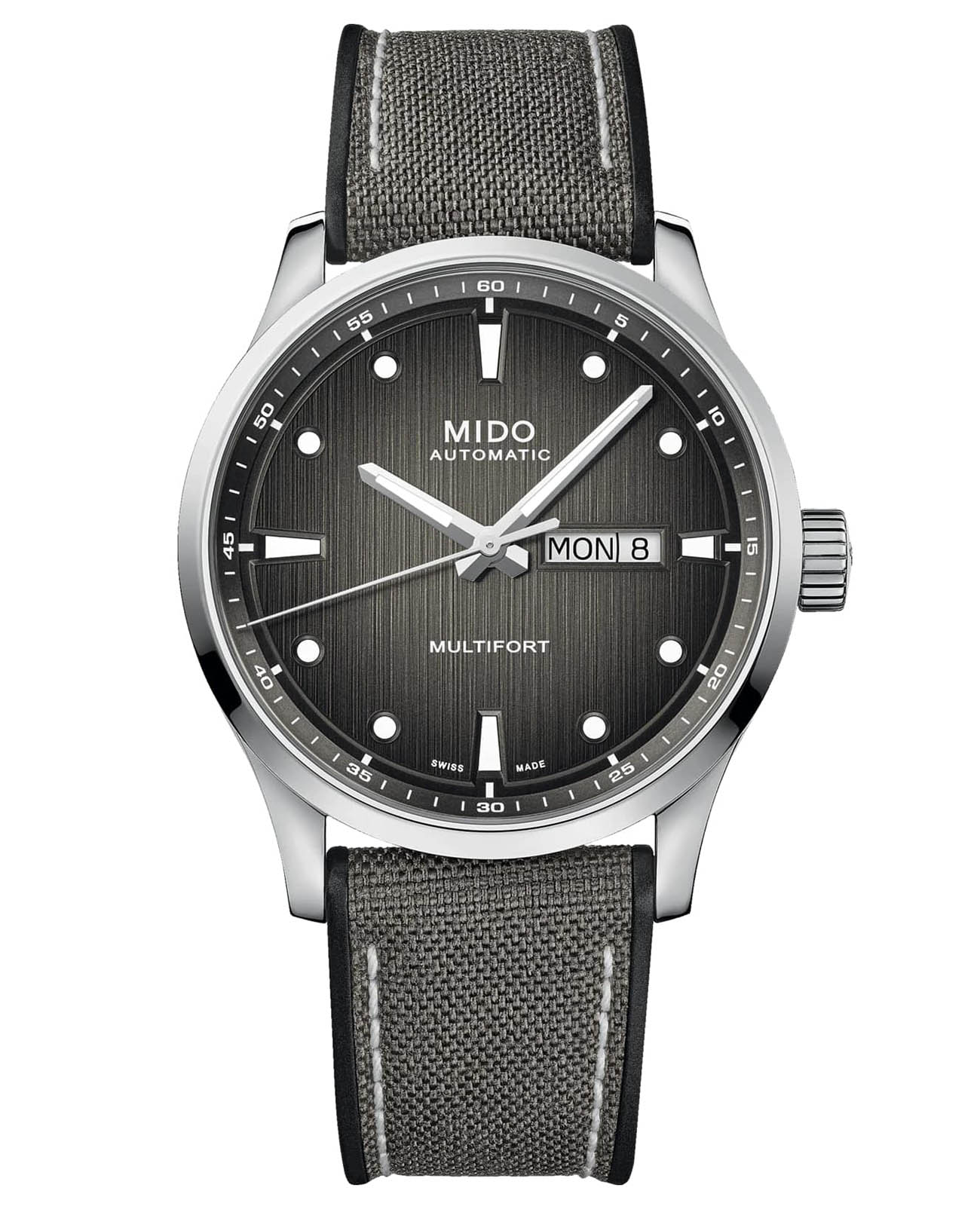 Вертикальная атласная отделка градиентного циферблата Multifort M напоминает о характерных чертах коллекции Côtes de Genève. Безупречное люминесцентное покрытиеЛюминесцентное покрытиеПозволяет считывать показания времени в темноте. Производители наносят на стрелки, часовые индексы, безель или поверхность циферблата светонакопительный состав, дающий холодное свечение. Super-LumiNova® создает контраст и читаемость на стрелках и круглых указателях. Легендарная надежность Multifort соответствует ритму знаменитого калибра 80. Запас хода до 80 часов обеспечивается Nivachron™Nivachron™Специально разработанный инновационный сплав Nivachron™ повышает устойчивость часов к воздействию магнитных полей. – революционного материала, обеспечивающего потрясающую точность. Mido предлагает Multifort M с системой смены ремня без инструментов, в стальном или текстильном исполнении на резиновой основе.