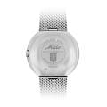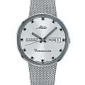Циферблат с фирменным логотипом Mido 1950-х годов украшен накладными индексами и стрелками  с люминесцентным покрытиемЛюминесцентное покрытиеПозволяет считывать показания времени в темноте. Производители наносят на стрелки, часовые индексы, безель или поверхность циферблата светонакопительный состав, дающий холодное свечение., обеспечивающим читаемость даже в условиях слабого освещения. На «3 часах» расположено двойное окошко календаря — день недели и дата. Стальной браслет миланского плетения на раскладном замкеРаскладной замокДанный вариант застежки используется только на часах с металлическим браслетом. Отличительная особенность такого крепления в том, что длина браслета становится универсальной и вы можете самостоятельно отрегулировать нужный вам размер – застежка просто двигается по браслету часов..Модель защищена акриловым стеклом, сохраняющим аутентичный винтажный характер. Прозрачная задняя крышка открывает вид на автоматический механизм с автоподзаводом и 80-часовым запасом хода.