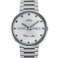 Серебристый циферблат с фирменным логотипом Mido 1950-х годов украшен накладными индексами и стрелками с люминесцентным покрытиемЛюминесцентное покрытиеПозволяет считывать показания времени в темноте. Производители наносят на стрелки, часовые индексы, безель или поверхность циферблата светонакопительный состав, дающий холодное свечение., обеспечивающим читаемость даже в условиях слабого освещения. На «3 часах» расположено двойное окошко календаря — день недели и дата. Стальной браслет на раскладной застёжкеРаскладная застёжкаТакой тип застёжки используется только на браслетах из металла. Она никогда не раскрывается полностью, происходит разделение на 2 и более частей. Раскладывающая застёжка снизит вероятность потери часов к минимуму..