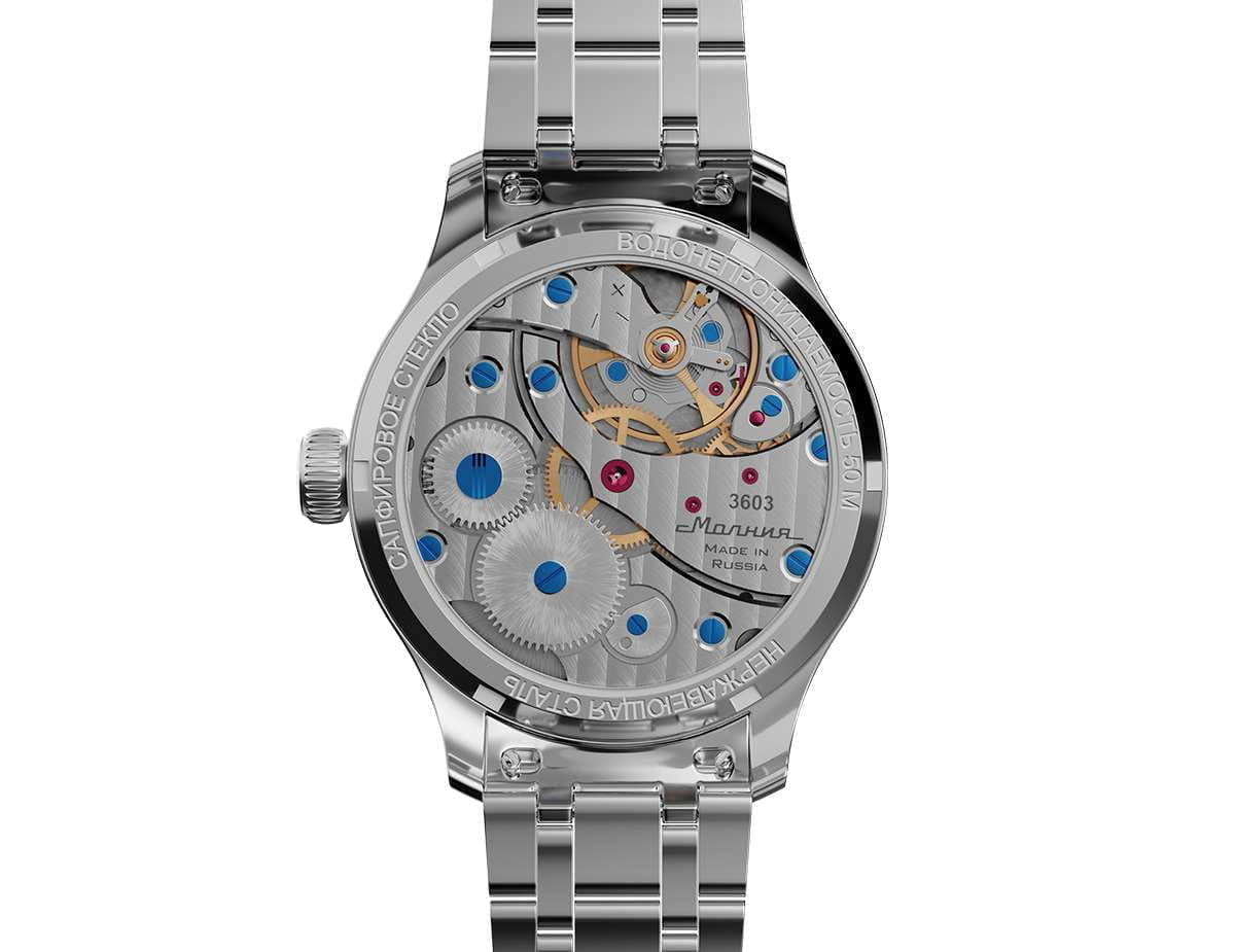 Мужские механические часы с ручным подзаводом — это аксессуар от легендарного бренда «МОЛНИЯ», созданный на Челябинском часовом заводе. Корпус диаметром 41 мм выполнен из нержавеющей стали 316L с зеркальной полировкой. БезельБезельВнешний ободок, закрепляющий стекло. В спортивных часах так называется поворотное кольцо с делениями на циферблате, выполняет роль таймера – замеряет отрезки времени на шкале. Неподвижный безель – элемент декора. Однонаправленно вращающийся безель на дайверских часах позволяет фиксировать моменты погружения и выныривания на поверхность. также выполнен из стали с зеркальной отделкой. Циферблат синего цвета оформлен индексами и стрелками. Малая секундная стрелка вынесена на позицию 9 часов. Циферблат защищён сапфировым стекломСапфировое стеклоПрочный и надёжный материал из кристалла сапфира синтетического происхождения, характеризующийся особой твёрдостью и устойчивостью к царапинам и повреждениям. толщиной 2 мм. Механизм — мануфактурный калибр 3603, собранный вручную, с запасом хода до 40 часов. Прозрачная задняя крышка позволяет наблюдать за работой механизма. Часы оснащены стальным браслетом с раскладной застёжкойРаскладная застёжкаТакой тип застёжки используется только на браслетах из металла. Она никогда не раскрывается полностью, происходит разделение на 2 и более частей. Раскладывающая застёжка снизит вероятность потери часов к минимуму. с кнопочным открытием и системой быстрой замены. Водонепроницаемость 50 м позволяет использовать часы в повседневных условиях. Идеальный выбор для тех, кто ценит российское качество и традиции.