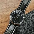 Ремешок выполнен из натуральной кожи чёрного цвета, обеспечивая комфорт при носке.  Толщина корпуса составляет 12 мм, что придаёт часам солидный вид.