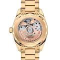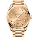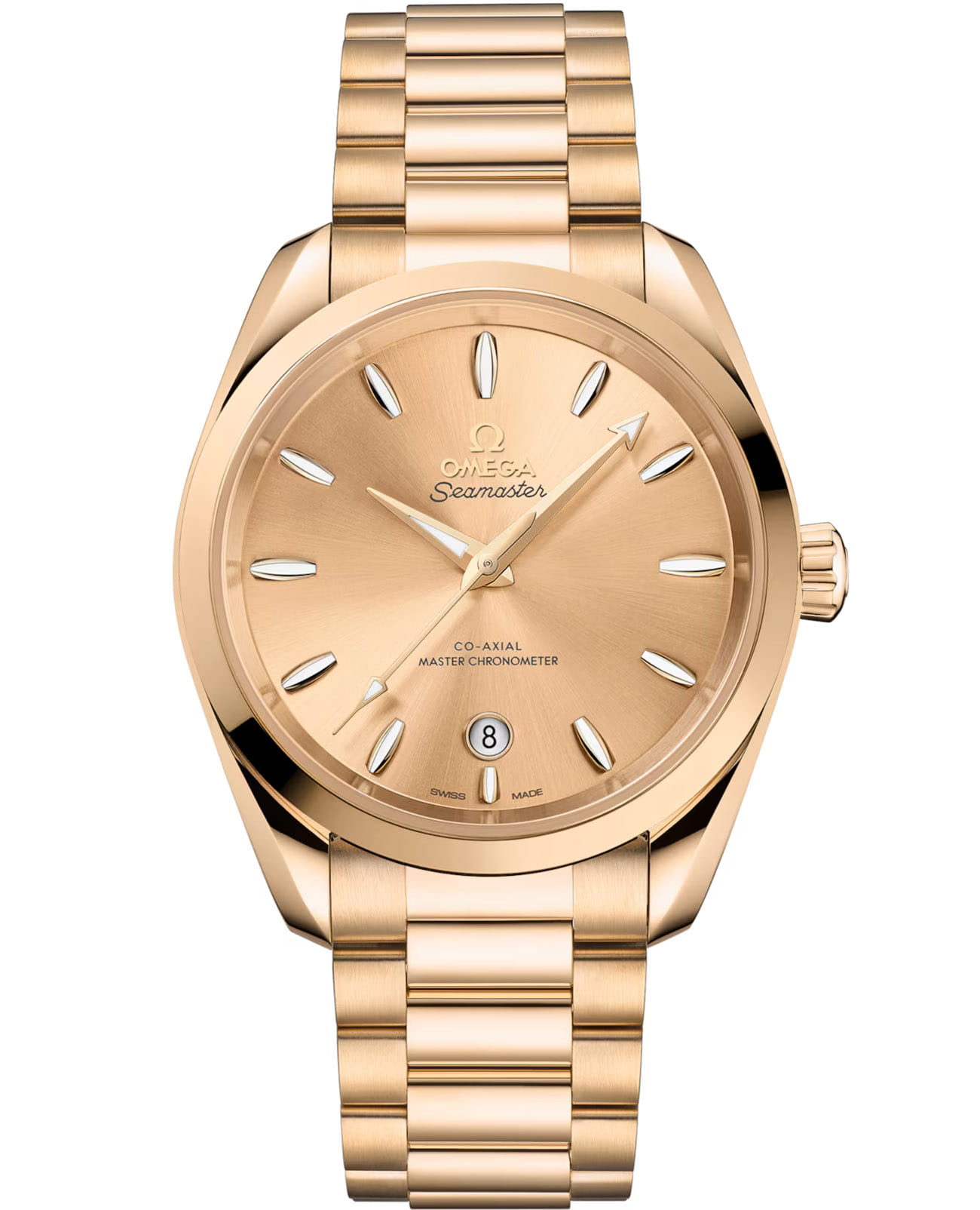 Omega Seamaster Aqua Terra выполнены в симметричном корпусе из 18K Moonshine™ золота с завинчивающейся задней крышкой, украшенной волновым узором. Циферблат дополнен окошком даты на 6 часах и оформлен в технике sun-brushed с PVD-покрытием, создающим мягкий металлический отлив. Стрелки и метки выполнены из 18K Moonshine™ золота и оснащены люминесцентным покрытиемЛюминесцентное покрытиеПозволяет считывать показания времени в темноте. Производители наносят на стрелки, часовые индексы, безель или поверхность циферблата светонакопительный состав, дающий холодное свечение. Super-LumiNova для лучшей читаемости в темноте. Индексы выполнены в форме корпусов парусников — деталь, подчёркивающая морское наследие коллекции. Калибр Omega 8801 сертифицирован как Master Chronometer — гарантия высочайшей точности и устойчивости к магнитным полям. Запас хода составляет 55 часов. Защиту циферблата обеспечивает сапфировое стеклоСапфировое стеклоПрочный и надёжный материал из кристалла сапфира синтетического происхождения, характеризующийся особой твёрдостью и устойчивостью к царапинам и повреждениям. с антибликовым покрытиемАнтибликовое покрытиеСлой оксида металла в 0,13-0,3 микрон, благодаря которому стекло часов не бликует и не отражает свет. Антибликовое покрытие уменьшает отражение света в 10 раз, обеспечивая отличную читаемость показателей циферблата. с обеих сторон. Водозащита позволяет использовать часы в воде без риска повреждения. Часы установлены на браслет из 18K Moonshine™ золота. Это сочетание премиального качества, технологичности и классического дизайна.