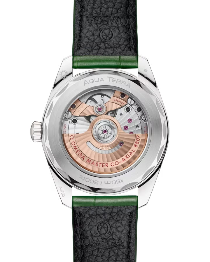 Omega Seamaster Aqua Terra выполнены в симметричном корпусе из 18K Canopus Gold™ — устойчивом к выцветанию и потускнению сплаве, сочетающем прочность и благородный внешний вид. Задняя крышка украшена волновым рисунком, отсылающим к морскому наследию коллекции. Циферблат дополнен окошком даты и оформлен уникальным волновым рисунком, созданным методом wire bonding — технологией, заимствованной из микроэлектроники. Основа циферблата изготовлена из 18K золота и покрыта PVD для стойкости цвета. Часовые метки представлены тсаваритами, а стрелки выполнены из белого золота и оснащены люминесцентным покрытиемЛюминесцентное покрытиеПозволяет считывать показания времени в темноте. Производители наносят на стрелки, часовые индексы, безель или поверхность циферблата светонакопительный состав, дающий холодное свечение. Super-LumiNova для лучшей читаемости в темноте. Калибр Omega 8807 сертифицирован как Master Chronometer — гарантия высочайшей точности и устойчивости к магнитным полям. Запас хода составляет 55 часов. Защиту циферблата обеспечивает сапфировое стеклоСапфировое стеклоПрочный и надёжный материал из кристалла сапфира синтетического происхождения, характеризующийся особой твёрдостью и устойчивостью к царапинам и повреждениям. с антибликовым покрытиемАнтибликовое покрытиеСлой оксида металла в 0,13-0,3 микрон, благодаря которому стекло часов не бликует и не отражает свет. Антибликовое покрытие уменьшает отражение света в 10 раз, обеспечивая отличную читаемость показателей циферблата. с обеих сторон. Водозащита позволяет использовать часы в воде без риска повреждения. Часы установлены на кожаный ремешок изумрудного цвета. Это сочетание премиального качества, технологичности и классического дизайна.