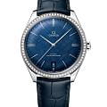 De Ville Trésor — современная интерпретация легендарной коллекции 1949 года, где традиции встречаются с инновациями. 40-мм корпус из нержавеющей стали с бриллиантовым безелемБезельВнешний ободок, закрепляющий стекло. В спортивных часах так называется поворотное кольцо с делениями на циферблате, выполняет роль таймера – замеряет отрезки времени на шкале. Неподвижный безель – элемент декора. Однонаправленно вращающийся безель на дайверских часах позволяет фиксировать моменты погружения и выныривания на поверхность. и синим кожаным ремешком воплощает изысканную простоту. Выпуклый синий циферблат с изящным узором украшен стрелками и индексами из белого золота18-каратное золотоОбозначение по каратной системе пробирования, оно показывает, сколько драгоценного металла содержится в изделии. 18 карат - в составе 75% чистого золота, соответствует 750 пробе.