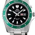 Чёрный циферблат с зелёным безелемБезельВнешний ободок, закрепляющий стекло. В спортивных часах так называется поворотное кольцо с делениями на циферблате, выполняет роль таймера – замеряет отрезки времени на шкале. Неподвижный безель – элемент декора. Однонаправленно вращающийся безель на дайверских часах позволяет фиксировать моменты погружения и выныривания на поверхность. не имеет лишних деталей. Японский автоматический калибр Orient 46943 имеет запас хода на 40 часов. Завинчивающаяся задняя крышка и заводная головка усиливают водостойкость в 200 метров. люминесцентная подсветкаЛюминесцентное покрытиеПозволяет считывать показания времени в темноте. Производители наносят на стрелки, часовые индексы, безель или поверхность циферблата светонакопительный состав, дающий холодное свечение. позволяет просматривать время и в темноте. На позиции 3 часов – окошко даты и дня недели.