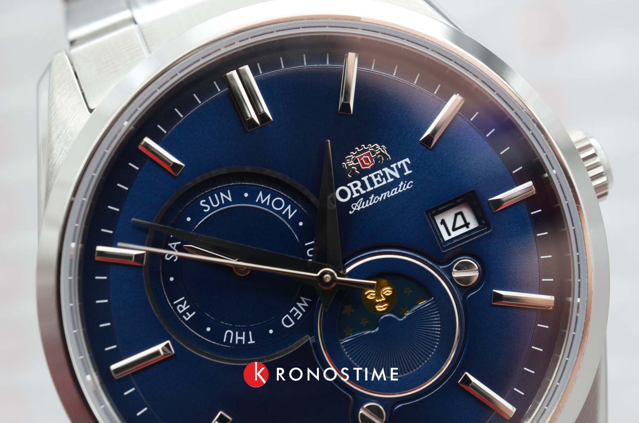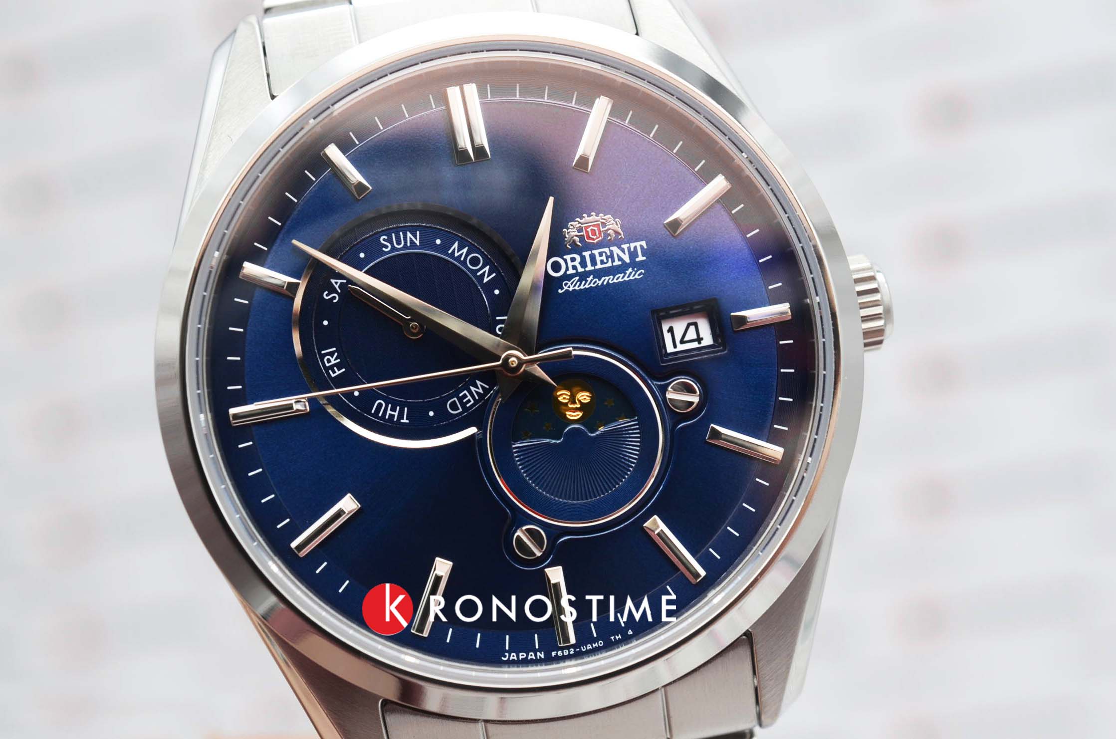 Часы Orient RA-AK0308L из коллекции Sun & Moon — это изысканная модель, сочетающая элегантный стиль и продвинутые функции. Корпус диаметром 42 мм выполнен из нержавеющей стали и защищён сапфировым стекломСапфировое стеклоПрочный и надёжный материал из кристалла сапфира синтетического происхождения, характеризующийся особой твёрдостью и устойчивостью к царапинам и повреждениям., обеспечивающим устойчивость к царапинам. Глубокий синий циферблат украшен серебристыми стрелками и , который элегантно отображает смену времени суток. Дополнительный индикатор дня недели и окошко даты на отметке «3 часа» придают модели функциональности и практичности. Автоматический механизм Orient Calibre F6B24 поддерживает ручной завод и функцию остановки секундной стрелки, обеспечивая точность и надёжность. Запас хода составляет до 40 часов. Браслет из нержавеющей стали с раскладной застёжкойРаскладная застёжкаТакой тип застёжки используется только на браслетах из металла. Она никогда не раскрывается полностью, происходит разделение на 2 и более частей. Раскладывающая застёжка снизит вероятность потери часов к минимуму. обеспечивает удобную посадку и надёжную фиксацию на запястье. Водонепроницаемость до 50 метров делает модель подходящей для повседневного использования. Orient RA-AK0308L — это идеальный выбор для ценителей японского качества, утончённого стиля и современных технологий.