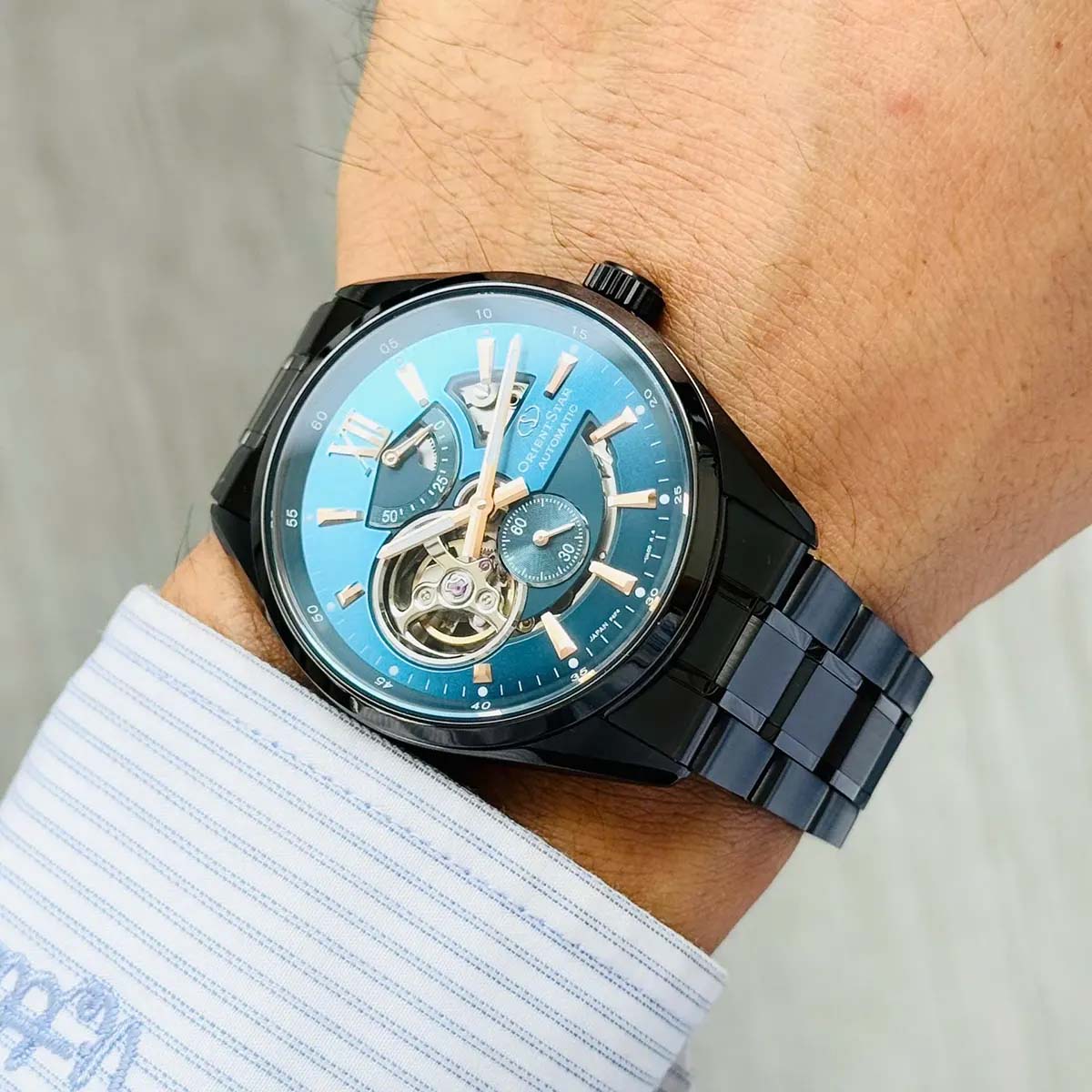 Часы Orient Star Joker Automatic RE-AV0131L — это стильное сочетание современного дизайна и часового мастерства. Корпус из нержавеющей стали с PVD-покрытиемPVDУльтратонкое покрытие наносится в технике вакуумного напыления, сочетает в себе нитрид титана особой прочности со слоем золота или оксида хрома. Несёт в себе декоративную или защитную функцию. диаметром 41 мм защищён сапфировым стекломСапфировое стеклоПрочный и надёжный материал из кристалла сапфира синтетического происхождения, характеризующийся особой твёрдостью и устойчивостью к царапинам и повреждениям. с антибликовым покрытиемАнтибликовое покрытиеСлой оксида металла в 0,13-0,3 микрон, благодаря которому стекло часов не бликует и не отражает свет. Антибликовое покрытие уменьшает отражение света в 10 раз, обеспечивая отличную читаемость показателей циферблата., что обеспечивает отличную видимость и защиту от царапин. Синий циферблат с открытыми элементами на отметках «9», «2» и «6 часов» позволяет наблюдать за изысканной работой механизма. Люминесцентные стрелки и меткиЛюминесцентное покрытиеПозволяет считывать показания времени в темноте. Производители наносят на стрелки, часовые индексы, безель или поверхность циферблата светонакопительный состав, дающий холодное свечение. обеспечивают превосходную читаемость даже в условиях низкой освещённости. Внутри установлен автоматический механизм Orient Calibre F6F44, который обеспечивает точность хода. Прозрачная задняя крышка добавляют функциональности и эстетического удовольствия. Браслет из нержавеющей стали с PVD-покрытиемPVDУльтратонкое покрытие наносится в технике вакуумного напыления, сочетает в себе нитрид титана особой прочности со слоем золота или оксида хрома. Несёт в себе декоративную или защитную функцию. оснащён раскладной застёжкойРаскладная застёжкаТакой тип застёжки используется только на браслетах из металла. Она никогда не раскрывается полностью, происходит разделение на 2 и более частей. Раскладывающая застёжка снизит вероятность потери часов к минимуму., что обеспечивает удобство и надёжность. Водонепроницаемость до 100 метров делает часы подходящими для плавания и активного использования. Orient Star Joker Automatic RE-AV0131L — это выбор для тех, кто ценит утончённость, стиль и высочайшее качество.