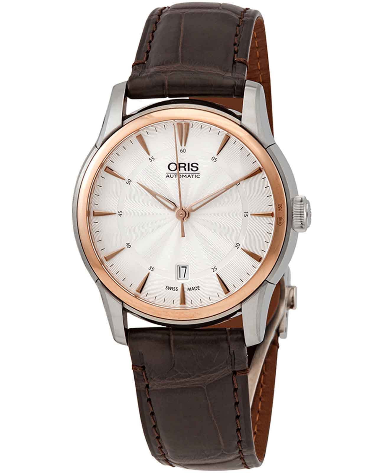 Oris 01 733 7670 6351-07 1 21 73FC Artelier – это элегантные часы, сочетающие в себе классический дизайн и современную функциональность. Корпус из нержавеющей стали диаметром 40 мм идеально подходит для тех, кто ценит утонченность и стиль. Сапфировое стеклоСапфировое стеклоПрочный и надёжный материал из кристалла сапфира синтетического происхождения, характеризующийся особой твёрдостью и устойчивостью к царапинам и повреждениям. с антибликовым покрытием защищает циферблат от царапин и обеспечивает отличную читаемость при любом освещении. Кожаный ремешок с раскладной застёжкойРаскладная застёжкаТакой тип застёжки используется только на браслетах из металла. Она никогда не раскрывается полностью, происходит разделение на 2 и более частей. Раскладывающая застёжка снизит вероятность потери часов к минимуму. идеально дополняет дизайн часов, обеспечивая комфортное ношение. Фиксированный безель с покрытием из 18-каратного золота18-каратное золотоОбозначение по каратной системе пробирования, оно показывает, сколько драгоценного металла содержится в изделии. 18 карат - в составе 75% чистого золота, соответствует 750 пробе.