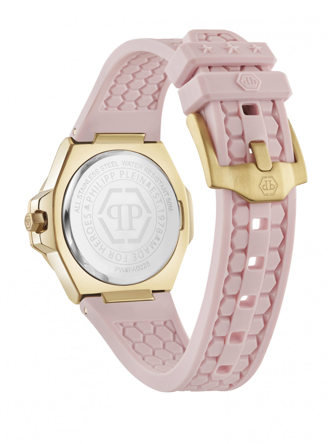 Женские кварцевые часы Philipp Plein Plein Royal Prestige PW4FA0225 — это стильное сочетание элегантности и современного дизайна. Изящный корпус выполнен из нержавеющей стали с PVD-покрытиемPVDУльтратонкое покрытие наносится в технике вакуумного напыления, сочетает в себе нитрид титана особой прочности со слоем золота или оксида хрома. Несёт в себе декоративную или защитную функцию. золотистого цвета, диаметром 33 мм, что придаст образу женственности и романтизма. Изысканный циферблат с метками в виде штрихов придает модели особый блеск. Циферблат защищен минеральным стекломМинеральное стеклоМинеральное стекло представляет собой искусственно выращенный минерал кварца. Такое стекло отличается особой устойчивостью к повреждениям и царапинам. Уступает по некоторым качествам сапфировому стеклу., обеспечивающий устойчивость к царапинам. Стрелки с люминесцентным покрытиемЛюминесцентное покрытиеПозволяет считывать показания времени в темноте. Производители наносят на стрелки, часовые индексы, безель или поверхность циферблата светонакопительный состав, дающий холодное свечение.. Часы оснащены надежным кварцевым механизмом. Силиконовый ремешок на стандартной застёжке, гарантирует комфортное и безопасное ношение. Класс водозащиты: 50 метров позволит защитить корпус от случайных брызг или капель дождя. Phlipp Plein — отличный выбор для тех, кто ценит яркость и качество.