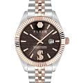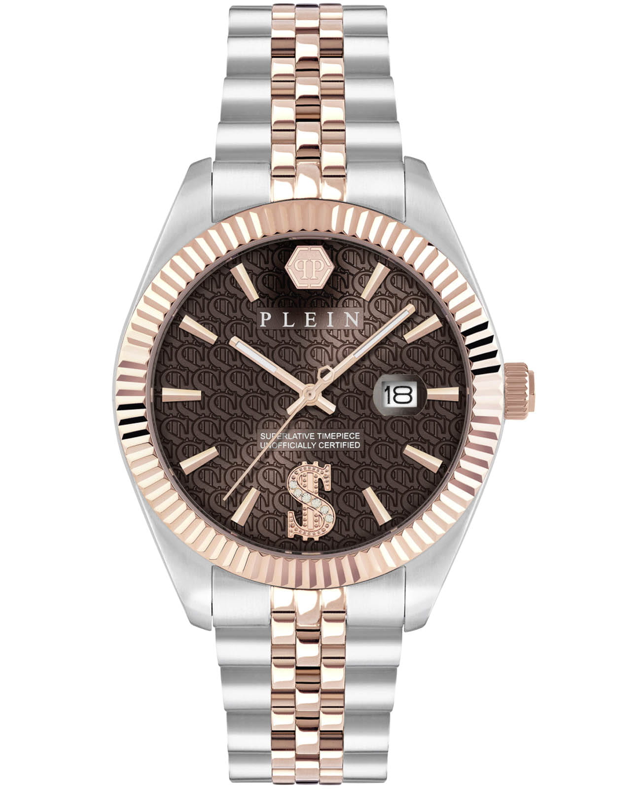 Philipp Plein Date Superlative PWMFA0925 - часы в современном дизайне несомненно добавят вам выразительности и станут главным акцентом вашего стильного образа. Мужские кварцевые часы с высокой точностью. Круглый стальной корпус серебристого цвета, диаметром 41 мм. Циферблат декорирован логотипом бренда в положении 12 часов, метки в виде штрихов. Минеральное стеклоМинеральное стеклоМинеральное стекло представляет собой искусственно выращенный минерал кварца. Такое стекло отличается особой устойчивостью к повреждениям и царапинам. Уступает по некоторым качествам сапфировому стеклу. защищает циферблат от царапин. Люминесцентное покрытиеЛюминесцентное покрытиеПозволяет считывать показания времени в темноте. Производители наносят на стрелки, часовые индексы, безель или поверхность циферблата светонакопительный состав, дающий холодное свечение. стрелок позволит следить за временем даже в полной темноте. Рифленый безельБезельВнешний ободок, закрепляющий стекло. В спортивных часах так называется поворотное кольцо с делениями на циферблате, выполняет роль таймера – замеряет отрезки времени на шкале. Неподвижный безель – элемент декора. Однонаправленно вращающийся безель на дайверских часах позволяет фиксировать моменты погружения и выныривания на поверхность. с PVD-покрытиемPVDУльтратонкое покрытие наносится в технике вакуумного напыления, сочетает в себе нитрид титана особой прочности со слоем золота или оксида хрома. Несёт в себе декоративную или защитную функцию. цвета розового золота. Окошко даты находится в положении 3 часа. Стальной браслет с частичным PVD-покрытиемPVDУльтратонкое покрытие наносится в технике вакуумного напыления, сочетает в себе нитрид титана особой прочности со слоем золота или оксида хрома. Несёт в себе декоративную или защитную функцию. на застёжке-бабочке с кнопкамиЗастёжка "бабочка"Такой вид застёжки дополняется предохранителями, помогающими избежать случайного раскрытия браслета. Обладают изящным исполнением. , обеспечивает комфортное ношение. Граненая заводная головка. Влагозащита: 50 метров, позволит защитить корпус от случайных брызг или капель дождя. Идеальный аксессуар для тех, кто ценит индивидуальность и не боится выделяться из толпы.