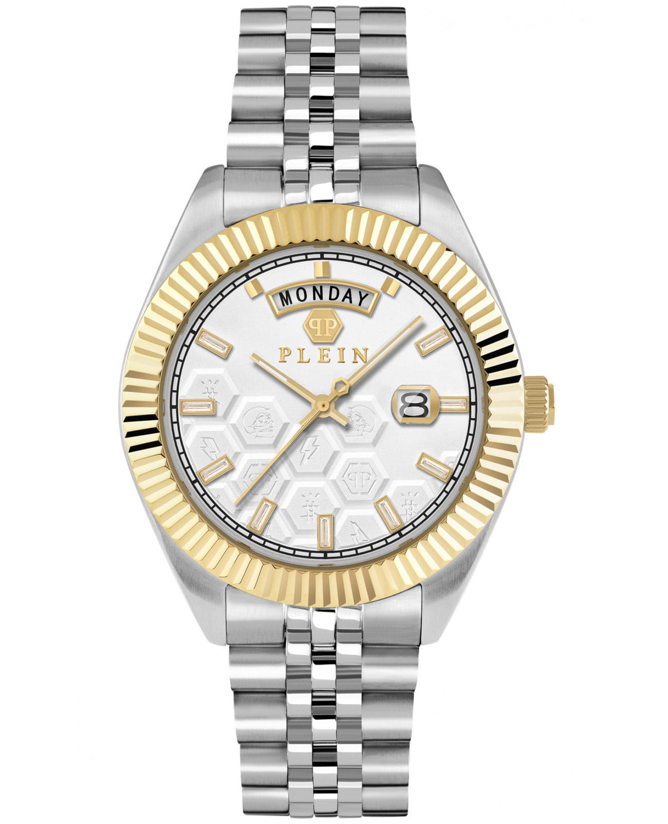 Часы Philipp Plein PWPVA0324 из коллекции Superlatives Gent сочетают элегантность и функциональность. Корпус диаметром 42 мм выполнен из нержавеющей стали, придающим изделию роскошный вид. Белый циферблат украшен фирменным логотипом бренда. Часы оснащены кварцевым механизмом, обеспечивающим точность хода. Минеральное стеклоМинеральное стеклоМинеральное стекло представляет собой искусственно выращенный минерал кварца. Такое стекло отличается особой устойчивостью к повреждениям и царапинам. Уступает по некоторым качествам сапфировому стеклу. защищает циферблат от повреждений, а люминесцентное покрытиеЛюминесцентное покрытиеПозволяет считывать показания времени в темноте. Производители наносят на стрелки, часовые индексы, безель или поверхность циферблата светонакопительный состав, дающий холодное свечение. на стрелках обеспечивают удобное считывание времени в условиях недостаточной освещённости. Водозащита 50WR позволяет использовать часы в повседневной жизни, включая случайные контакты с водой. Стальной браслет на застёжке-бабочке с кнопкамиЗастёжка "бабочка"Такой вид застёжки дополняется предохранителями, помогающими избежать случайного раскрытия браслета. Обладают изящным исполнением. . Эти часы идеально подойдут для тех, кто ценит стиль и функциональность в одном аксессуаре. БезельБезельВнешний ободок, закрепляющий стекло. В спортивных часах так называется поворотное кольцо с делениями на циферблате, выполняет роль таймера – замеряет отрезки времени на шкале. Неподвижный безель – элемент декора. Однонаправленно вращающийся безель на дайверских часах позволяет фиксировать моменты погружения и выныривания на поверхность. с IP-покрытиемIP-покрытиеМетод ионного напыления. Демонстрирует повышенную устойчивость к истиранию, окислению и химическим веществам. Под воздействием высокого давления и температуры около 1500°C молекулы металла надёжно соединяются с частицами корпуса часов..
