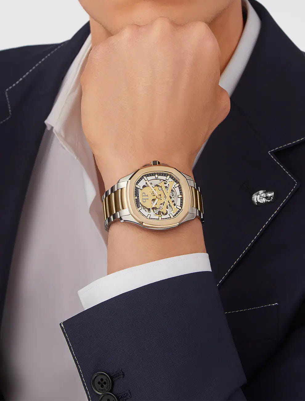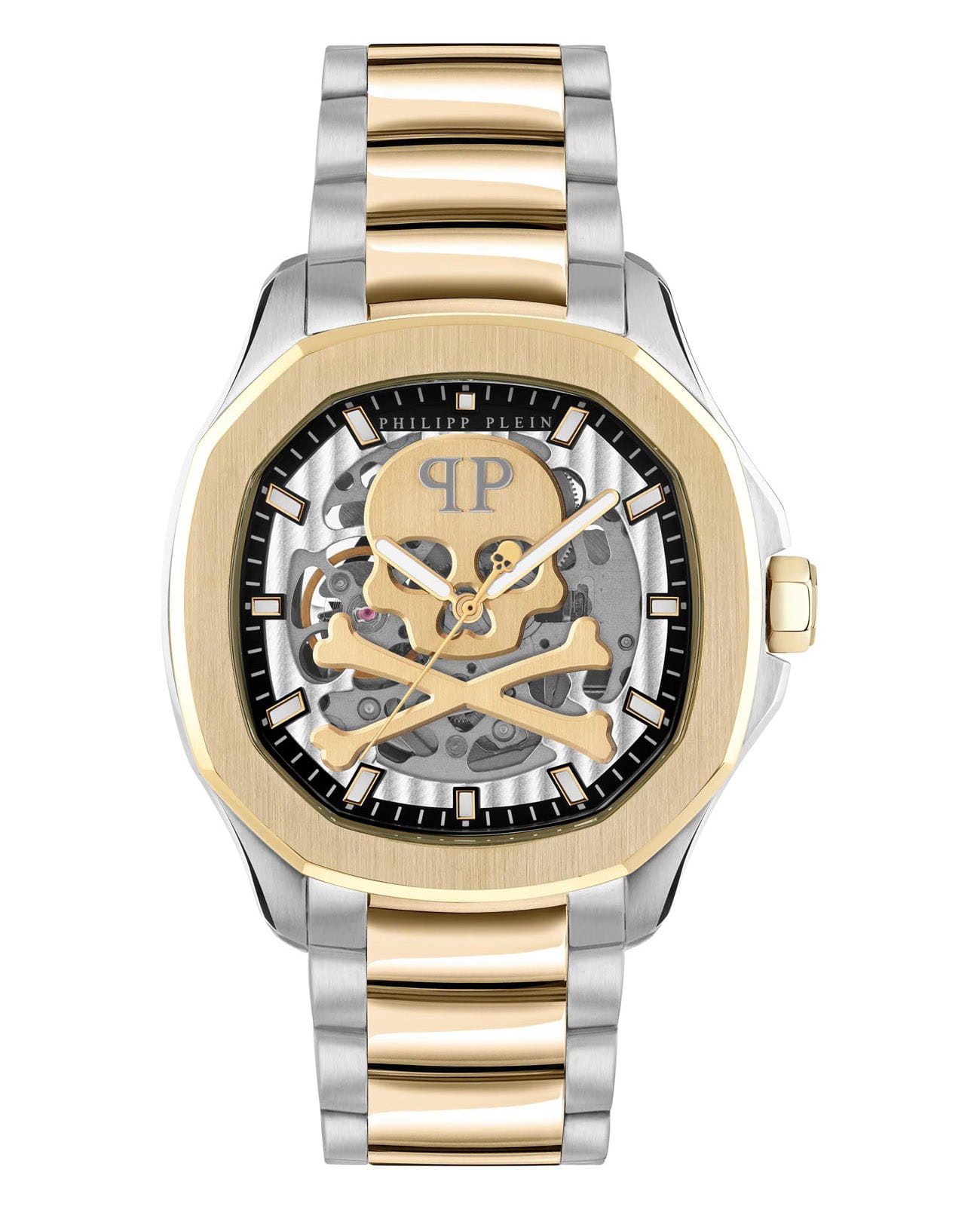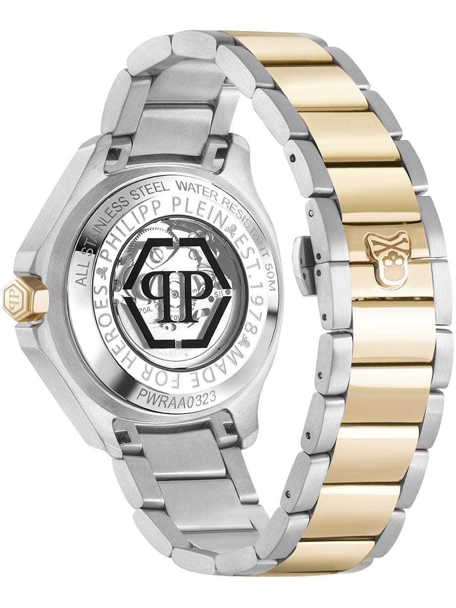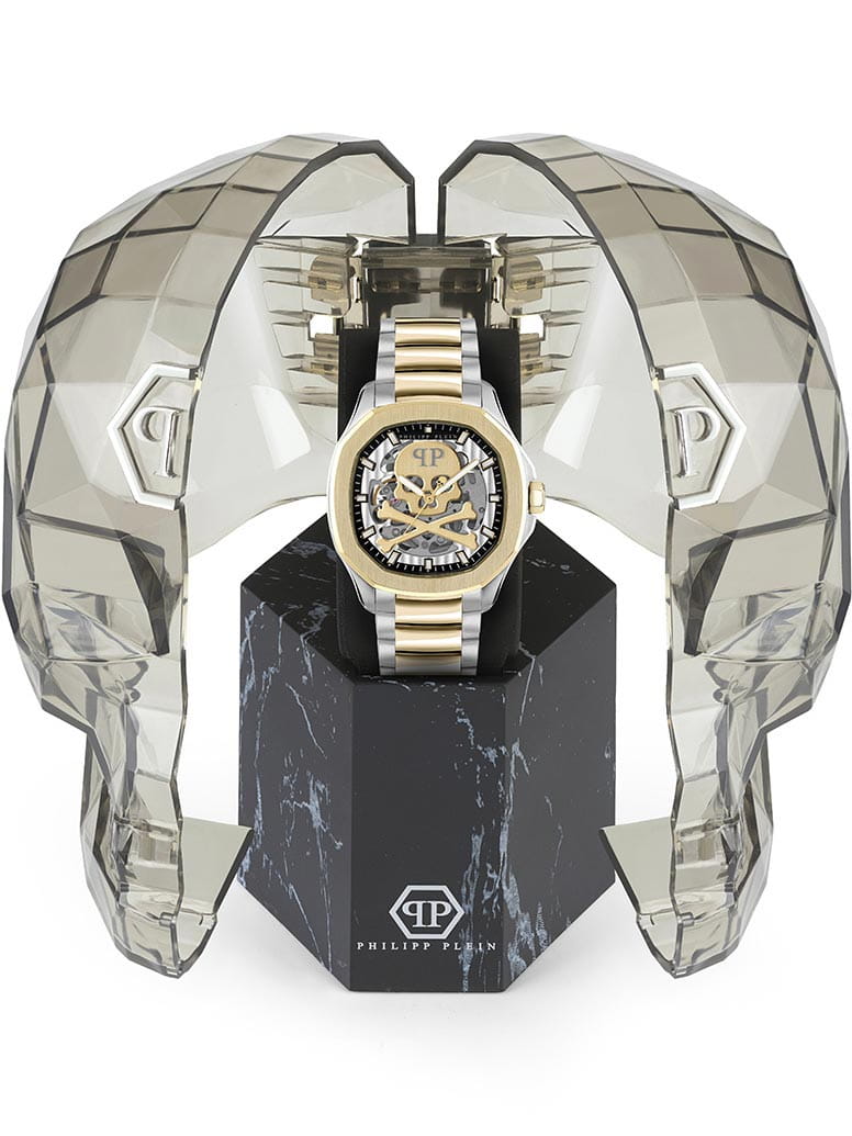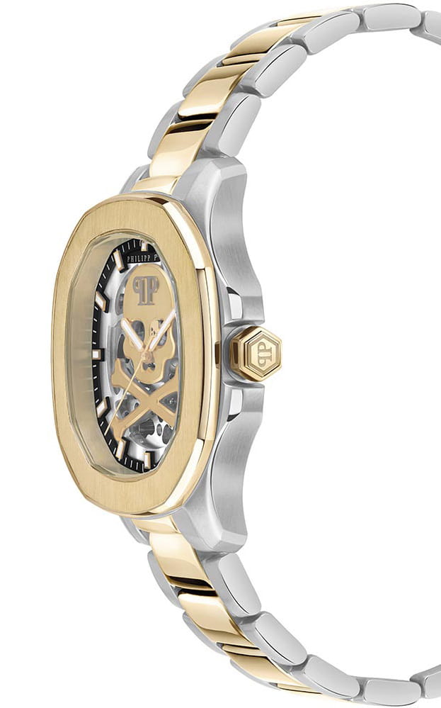 Яркие мужские часы с минеральным стекломМинеральное стеклоМинеральное стекло представляет собой искусственно выращенный минерал кварца. Такое стекло отличается особой устойчивостью к повреждениям и царапинам. Уступает по некоторым качествам сапфировому стеклу. Philipp Plein PWRAA0323, механический механизм с автоподзаводом.  Класс водозащиты: 50 метров, позволит защитить корпус от случайных брызг или капель дождя. Корпус часов изготовлен из стали с IP-покрытиемIP-покрытиеМетод ионного напыления. Демонстрирует повышенную устойчивость к истиранию, окислению и химическим веществам. Под воздействием высокого давления и температуры около 1500°C молекулы металла надёжно соединяются с частицами корпуса часов.. Стрелки и метки с люминесцентным покрытиемЛюминесцентное покрытиеПозволяет считывать показания времени в темноте. Производители наносят на стрелки, часовые индексы, безель или поверхность циферблата светонакопительный состав, дающий холодное свечение.. Скелетонизированные. Часы с механизмом, из которого удалён весь «лишний» металл, с прозрачными циферблатом и задней крышкой. Застёжка бабочка с кнопкамиЗастёжка "бабочка"Такой вид застёжки дополняется предохранителями, помогающими избежать случайного раскрытия браслета. Обладают изящным исполнением.