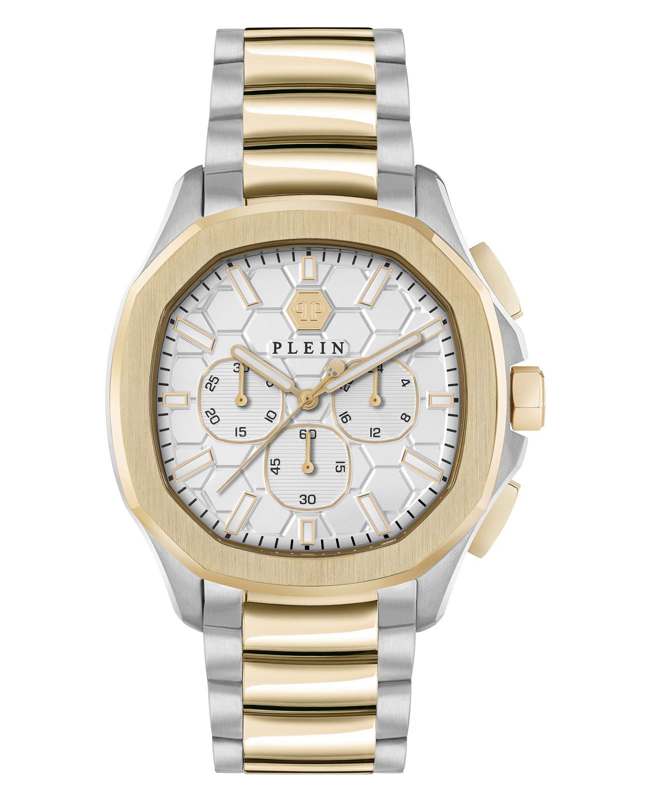 Яркие мужские часы-хронографХронографФункция позволяет измерять отрезки времени с особой точностью: часы, минуты, секунды. Верным признаком хронографа является наличие на циферблате 3 дополнительных окошек-счётчиков. с секундомеромСекундомерСекундоме́р — прибор, способный измерять интервалы времени с точностью до долей секунды. Philipp Plein PWSAA0423, кварцевый механизм с высокой точностью. Класс водозащиты: 50 метров, позволит защитить корпус от случайных брызг или капель дождя. Корпус часов изготовлен из стали с IP-покрытиемIP-покрытиеМетод ионного напыления. Демонстрирует повышенную устойчивость к истиранию, окислению и химическим веществам. Под воздействием высокого давления и температуры около 1500°C молекулы металла надёжно соединяются с частицами корпуса часов.. Стрелки и метки с люминесцентным покрытиемЛюминесцентное покрытиеПозволяет считывать показания времени в темноте. Производители наносят на стрелки, часовые индексы, безель или поверхность циферблата светонакопительный состав, дающий холодное свечение.. Застёжка бабочка с кнопкамиЗастёжка "бабочка"Такой вид застёжки дополняется предохранителями, помогающими избежать случайного раскрытия браслета. Обладают изящным исполнением.