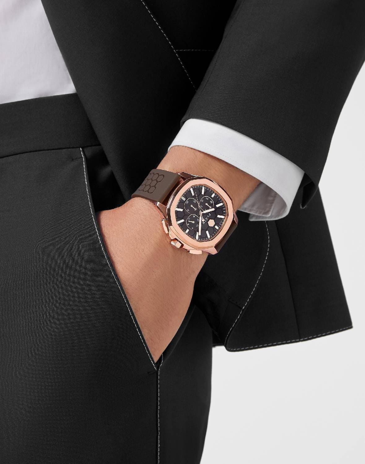 Яркие мужские часы-хронографХронографФункция позволяет измерять отрезки времени с особой точностью: часы, минуты, секунды. Верным признаком хронографа является наличие на циферблате 3 дополнительных окошек-счётчиков. с секундомеромСекундомерСекундоме́р — прибор, способный измерять интервалы времени с точностью до долей секунды. Philipp Plein PWSAA0523, кварцевый механизм с высокой точностью. Класс водозащиты: 50 метров, позволит защитить корпус от случайных брызг или капель дождя. Корпус часов изготовлен из стали с IP-покрытиемIP-покрытиеМетод ионного напыления. Демонстрирует повышенную устойчивость к истиранию, окислению и химическим веществам. Под воздействием высокого давления и температуры около 1500°C молекулы металла надёжно соединяются с частицами корпуса часов.. Стрелки и метки с люминесцентным покрытиемЛюминесцентное покрытиеПозволяет считывать показания времени в темноте. Производители наносят на стрелки, часовые индексы, безель или поверхность циферблата светонакопительный состав, дающий холодное свечение..