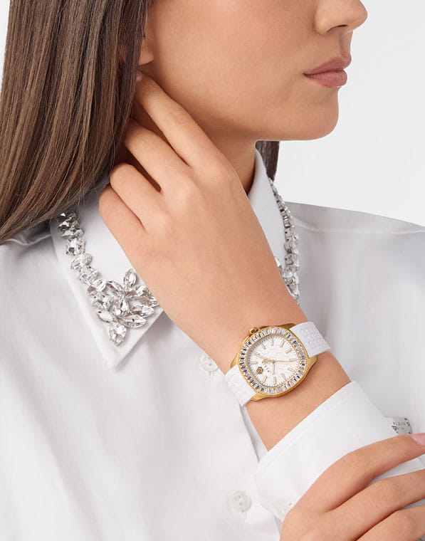 Philipp Plein THE $PECTRE LADY PWTAA0924 - дерзкое заявление любви к роскоши и бунтарскому стилю. Диаметр корпуса из прочной нержавеющей стали с PVD-покрытиемPVDУльтратонкое покрытие наносится в технике вакуумного напыления, сочетает в себе нитрид титана особой прочности со слоем золота или оксида хрома. Несёт в себе декоративную или защитную функцию. равен 38 мм. Силиконовый ремешок на стандартной застёжке обеспечивает надёжную фиксацию и комфортное ношение. Минеральное стеклоМинеральное стеклоМинеральное стекло представляет собой искусственно выращенный минерал кварца. Такое стекло отличается особой устойчивостью к повреждениям и царапинам. Уступает по некоторым качествам сапфировому стеклу. защищает циферблат от царапин. Люминесцентное покрытиеЛюминесцентное покрытиеПозволяет считывать показания времени в темноте. Производители наносят на стрелки, часовые индексы, безель или поверхность циферблата светонакопительный состав, дающий холодное свечение. стрелок и меток позволит следить за временем даже в полной темноте. БезельБезельВнешний ободок, закрепляющий стекло. В спортивных часах так называется поворотное кольцо с делениями на циферблате, выполняет роль таймера – замеряет отрезки времени на шкале. Неподвижный безель – элемент декора. Однонаправленно вращающийся безель на дайверских часах позволяет фиксировать моменты погружения и выныривания на поверхность. инкрустирован кристаллами Preciosa. Влагозащита: 50 метров, позволит защитить корпус от случайных брызг или капель дождя. Идеальный аксессуар для тех, кто ценит индивидуальность и не боится выделяться из толпы.