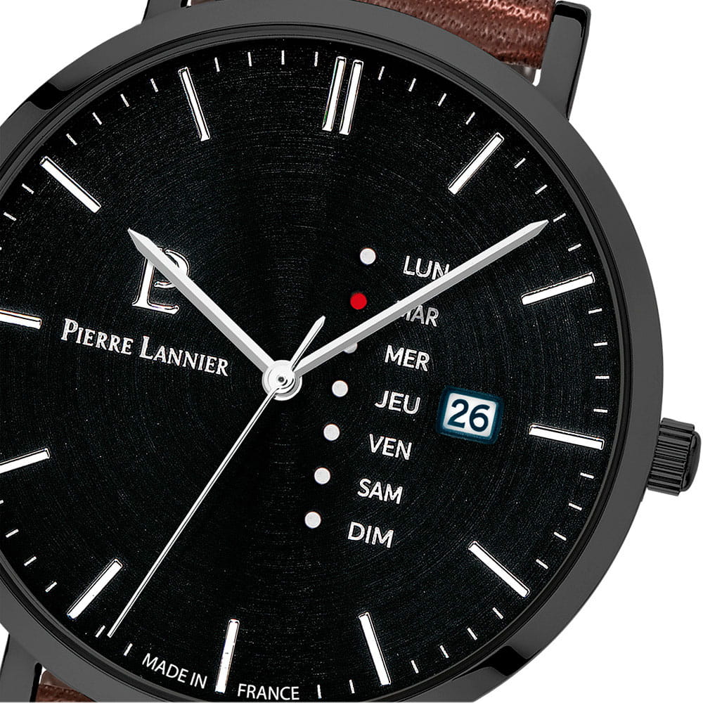Мужские кварцевые часы Pierre Lannier Data 243H434. Минеральное стеклоМинеральное стеклоМинеральное стекло представляет собой искусственно выращенный минерал кварца. Такое стекло отличается особой устойчивостью к повреждениям и царапинам. Уступает по некоторым качествам сапфировому стеклу. устойчивое к мелким механическим повреждениям. Центральные часовая и минутная стрелки. Апертура даты в позиции 3 часов. Отображение дня недели. Корпус выполнен из нержавеющей стали с IP-покрытиемIP-покрытиеМетод ионного напыления. Демонстрирует повышенную устойчивость к истиранию, окислению и химическим веществам. Под воздействием высокого давления и температуры около 1500°C молекулы металла надёжно соединяются с частицами корпуса часов.. Водостойкость: 30 метров, позволит защитить корпус от случайных брызг или капель дождя. Кожаный ремешок на стандартной застёжке.
