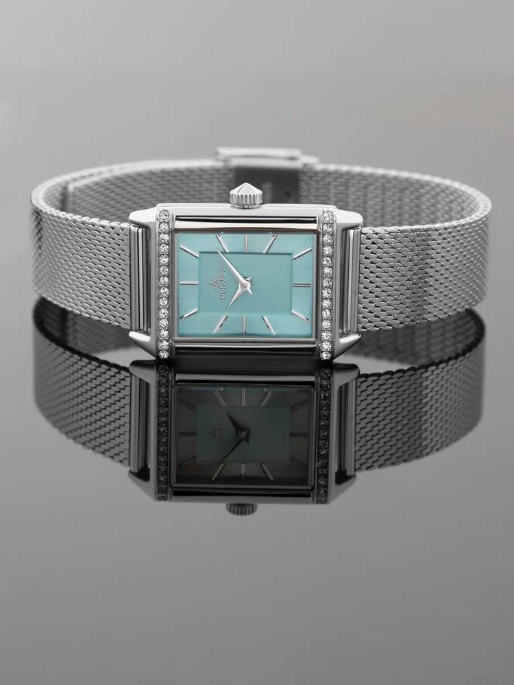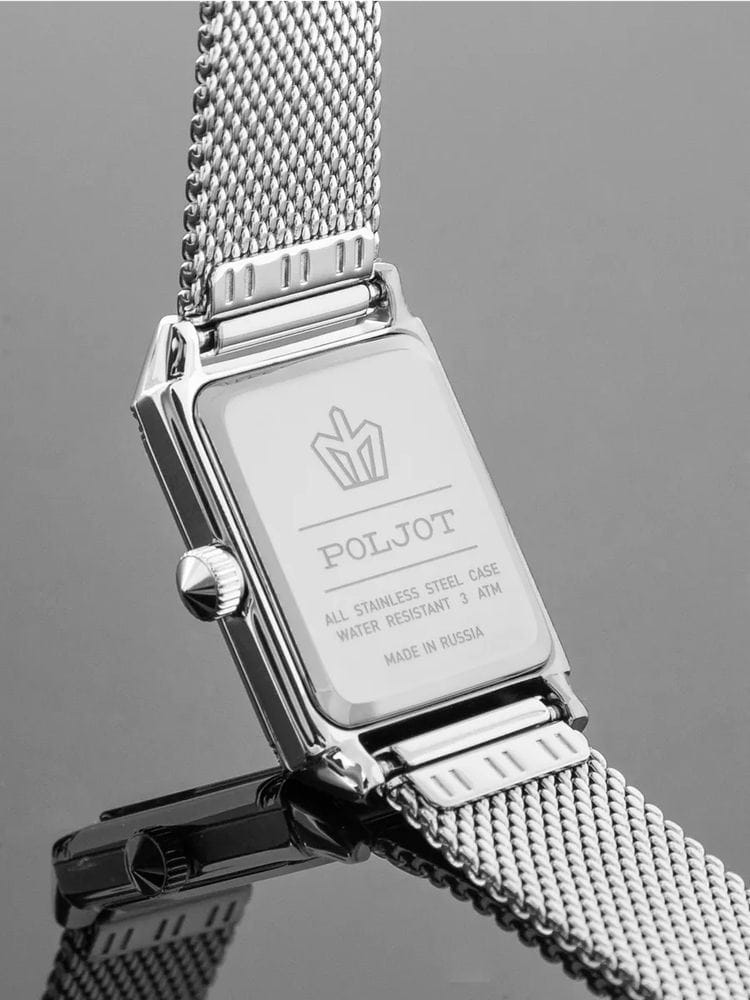 Poljot VX50.1841320 — утончённые женские кварцевые часы, вдохновлённые эстетикой ретро-гламура и современной сдержанностью. Прямоугольный корпус из нержавеющей стали с аккуратной инкрустацией придаёт модели изысканный блеск, а нежный бирюзовый циферблат создаёт мягкий контраст и ощущение воздушности. Минималистичные стрелки и метки подчёркивают лаконичность дизайна, сохраняя при этом утончённую женственность. Точный японский механизм гарантирует надёжную работу, а прочное минеральное стеклоМинеральное стеклоМинеральное стекло представляет собой искусственно выращенный минерал кварца. Такое стекло отличается особой устойчивостью к повреждениям и царапинам. Уступает по некоторым качествам сапфировому стеклу. защищает поверхность от повреждений. Металлический миланский браслет на раскладном замкеРаскладной замокДанный вариант застежки используется только на часах с металлическим браслетом. Отличительная особенность такого крепления в том, что длина браслета становится универсальной и вы можете самостоятельно отрегулировать нужный вам размер – застежка просто двигается по браслету часов. комфортно облегает запястье, добавляя образу лёгкости и элегантного сияния. Poljot — это украшение и аксессуар в одном, идеальный выбор для женщины, ценящей благородный стиль и безупречное чувство вкуса.