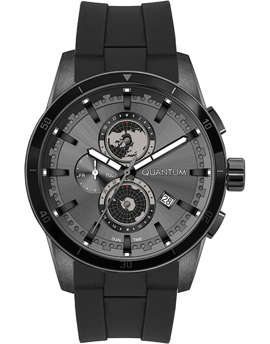 Мужские часы c хронографомХронографФункция позволяет измерять отрезки времени с особой точностью: часы, минуты, секунды. Верным признаком хронографа является наличие на циферблате 3 дополнительных окошек-счётчиков. Quantum Adrenaline ADG991.051, кварцевый механизм с высокой точностью. Минеральное стеклоМинеральное стеклоМинеральное стекло представляет собой искусственно выращенный минерал кварца. Такое стекло отличается особой устойчивостью к повреждениям и царапинам. Уступает по некоторым качествам сапфировому стеклу. устойчивое к появлению царапин, обладающее высокой прозрачностью. Класс водозащиты: 50 метров, позволит защитить корпус от случайных брызг или капель дождя. Корпус часов изготовлен из стали с IP-покрытиемIP-покрытиеМетод ионного напыления. Демонстрирует повышенную устойчивость к истиранию, окислению и химическим веществам. Под воздействием высокого давления и температуры около 1500°C молекулы металла надёжно соединяются с частицами корпуса часов.. Силиконовый ремешок. Окошко даты находится в положении 4 часов. Стрелки и метки с люминесцентным покрытиемЛюминесцентное покрытиеПозволяет считывать показания времени в темноте. Производители наносят на стрелки, часовые индексы, безель или поверхность циферблата светонакопительный состав, дающий холодное свечение..