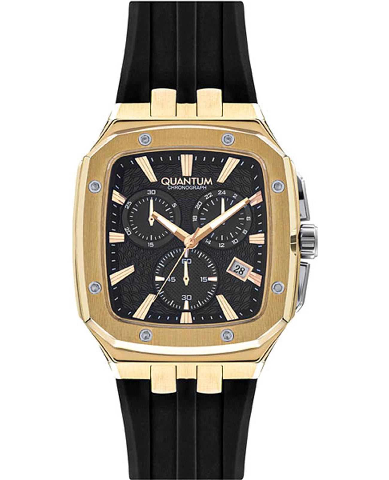 Мужские наручные часы-хронографХронографФункция позволяет измерять отрезки времени с особой точностью: часы, минуты, секунды. Верным признаком хронографа является наличие на циферблате 3 дополнительных окошек-счётчиков. Quantum HNG1033.151, кварцевый механизм с высокой точностью. Минеральное стеклоМинеральное стеклоМинеральное стекло представляет собой искусственно выращенный минерал кварца. Такое стекло отличается особой устойчивостью к повреждениям и царапинам. Уступает по некоторым качествам сапфировому стеклу. устойчивое к появлению царапин, обладающее высокой прозрачностью. Класс водозащиты: 100 метров, позволит плавать, нырять и заниматься другими водными видами спорта. Корпус часов изготовлен из стали с PVD-покрытиемPVDУльтратонкое покрытие наносится в технике вакуумного напыления, сочетает в себе нитрид титана особой прочности со слоем золота или оксида хрома. Несёт в себе декоративную или защитную функцию.. Стрелки с люминесцентным покрытиемЛюминесцентное покрытиеПозволяет считывать показания времени в темноте. Производители наносят на стрелки, часовые индексы, безель или поверхность циферблата светонакопительный состав, дающий холодное свечение.. Силиконовый ремешок.