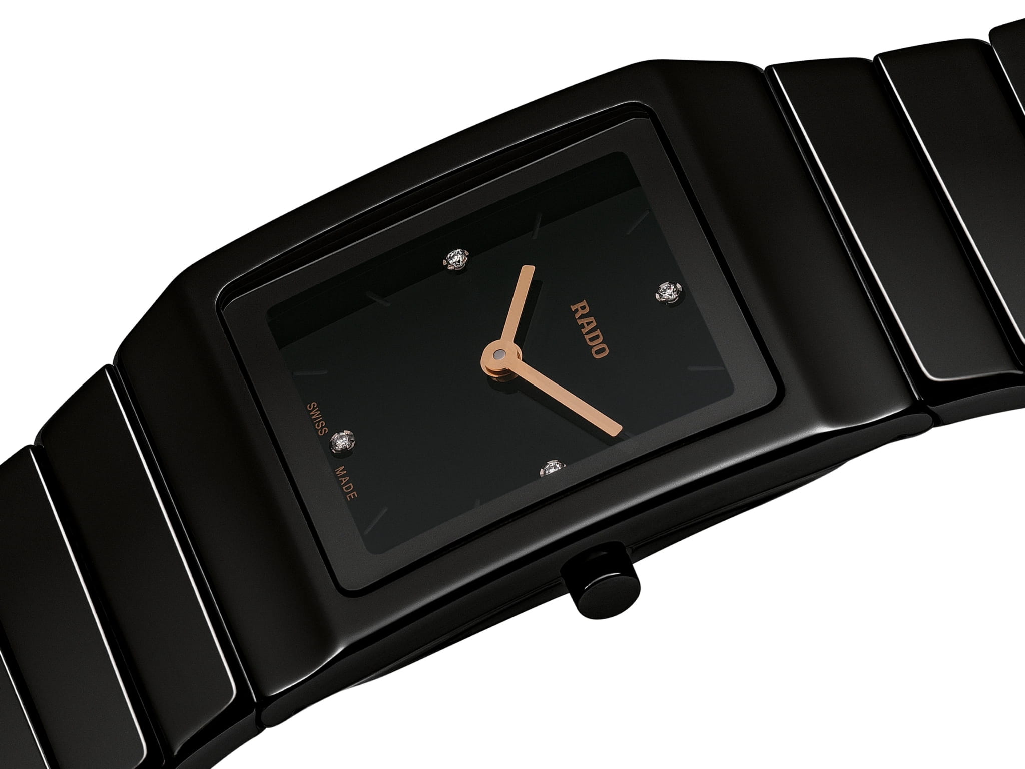 Чёрный прямоугольный циферблат с золотистыми стрелками находится в обрамлении надёжного керамического корпуса. В качестве украшения используются 4 бриллианта в 0,011 карат, драгоценные камни добавляют красоты и изящества. Чёткие геометрические формы. Кварцевый швейцарский механизм ETA 282.001 с высокой точностью хода. Использование высокотехнологичной керамикиВысокотехнологичная керамикаИнновационный запатентованный Rado материал с гладкой или матовой поверхностью. Керамика за счёт кристаллической структуры обладает повышенной устойчивостью от возникновения царапин. Материал способен принимать температуру тела человека, обеспечивая невероятный комфорт при ношении.. Стекло из сапфира. Водонепроницаемость при давлении 5 бар. Габариты: 31,7 x 22,9 x 6,6 мм.