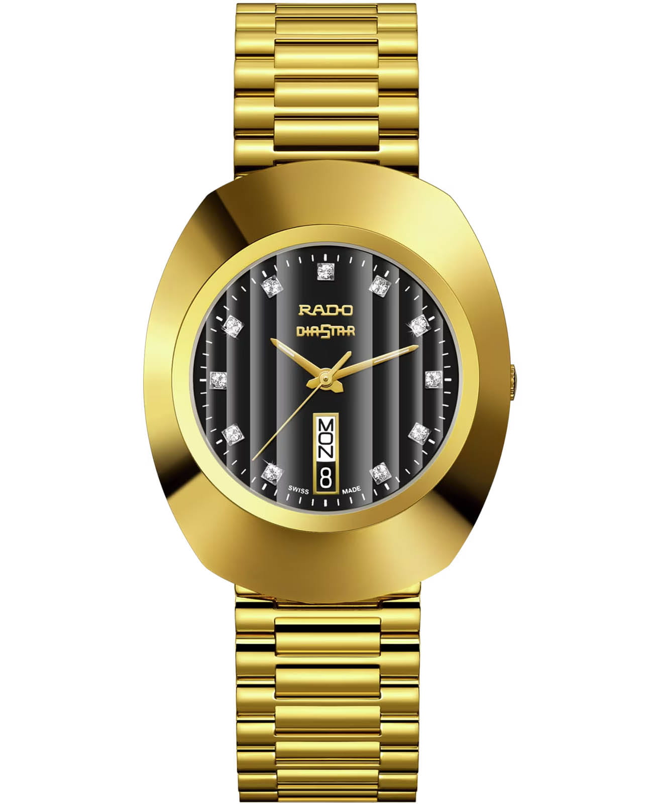 Мужские часы Rado The Original R12304313 с надёжным кварцевым механизмом. Корпус и браслет часов выполнены из нержавеющей стали с PVD-покрытиемPVDУльтратонкое покрытие наносится в технике вакуумного напыления, сочетает в себе нитрид титана особой прочности со слоем золота или оксида хрома. Несёт в себе декоративную или защитную функцию.. Стрелки с люминесцентным покрытиемЛюминесцентное покрытиеПозволяет считывать показания времени в темноте. Производители наносят на стрелки, часовые индексы, безель или поверхность циферблата светонакопительный состав, дающий холодное свечение. Super-LumiNova. Стальной браслет на раскладной застёжкеРаскладная застёжкаТакой тип застёжки используется только на браслетах из металла. Она никогда не раскрывается полностью, происходит разделение на 2 и более частей. Раскладывающая застёжка снизит вероятность потери часов к минимуму... Класс водозащиты: 30 метров, позволит защитить корпус от случайных брызг или капель дождя. Циферблат инкрустирован сапфирами. Окошки дня недели и даты находятся в положении 6 часов.