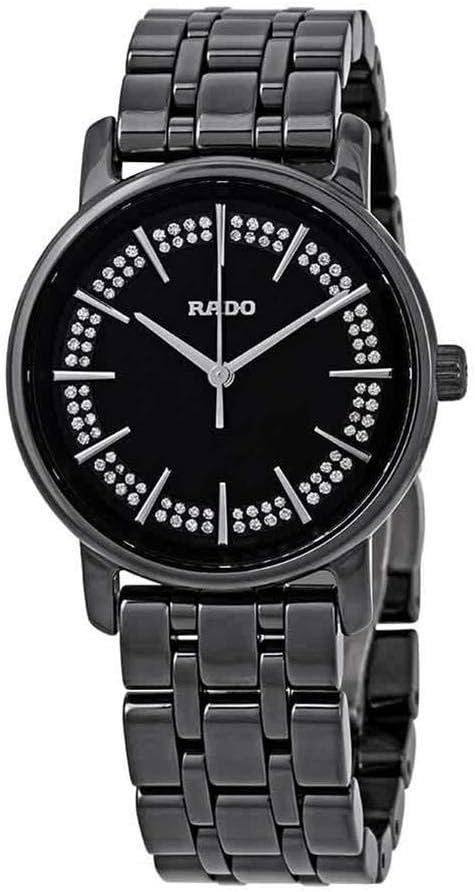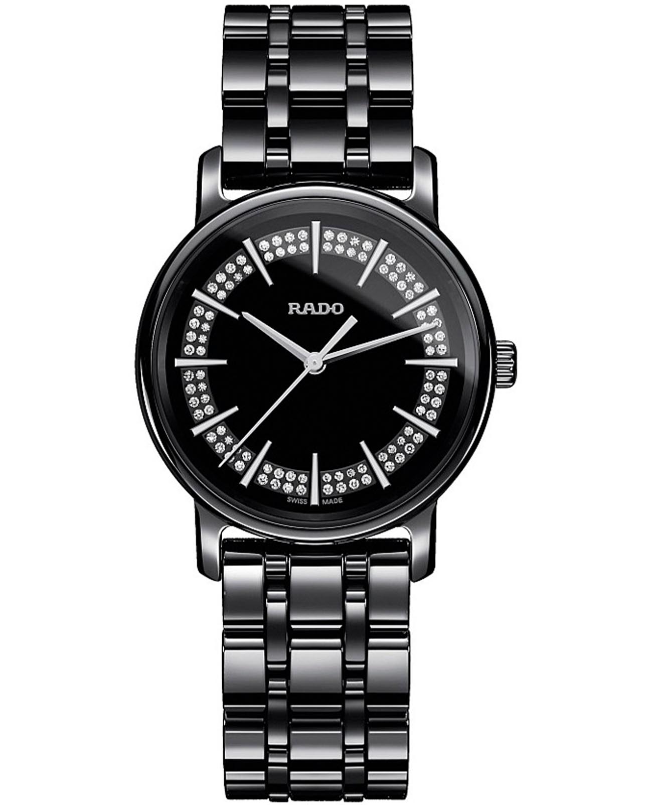 Швейцарские женские часы с бриллиантами Rado Diamaster R14063727, кварцевый механизм с высокой точностью. Сапфировое стеклоСапфировое стеклоПрочный и надёжный материал из кристалла сапфира синтетического происхождения, характеризующийся особой твёрдостью и устойчивостью к царапинам и повреждениям. устойчивое к появлению царапин, обладающее высокой прозрачностью. Класс водозащиты: 50 метров, позволит защитить корпус от случайных брызг или капель дождя. Циферблат с метками в виде штрихов и бриллиантов. Корпус и браслет часов изготовлен из высокотехнологичной керамикиВысокотехнологичная керамикаИнновационный запатентованный Rado материал с гладкой или матовой поверхностью. Керамика за счёт кристаллической структуры обладает повышенной устойчивостью от возникновения царапин. Материал способен принимать температуру тела человека, обеспечивая невероятный комфорт при ношении., браслет на раскладной застёжкеРаскладная застёжкаТакой тип застёжки используется только на браслетах из металла. Она никогда не раскрывается полностью, происходит разделение на 2 и более частей. Раскладывающая застёжка снизит вероятность потери часов к минимуму..