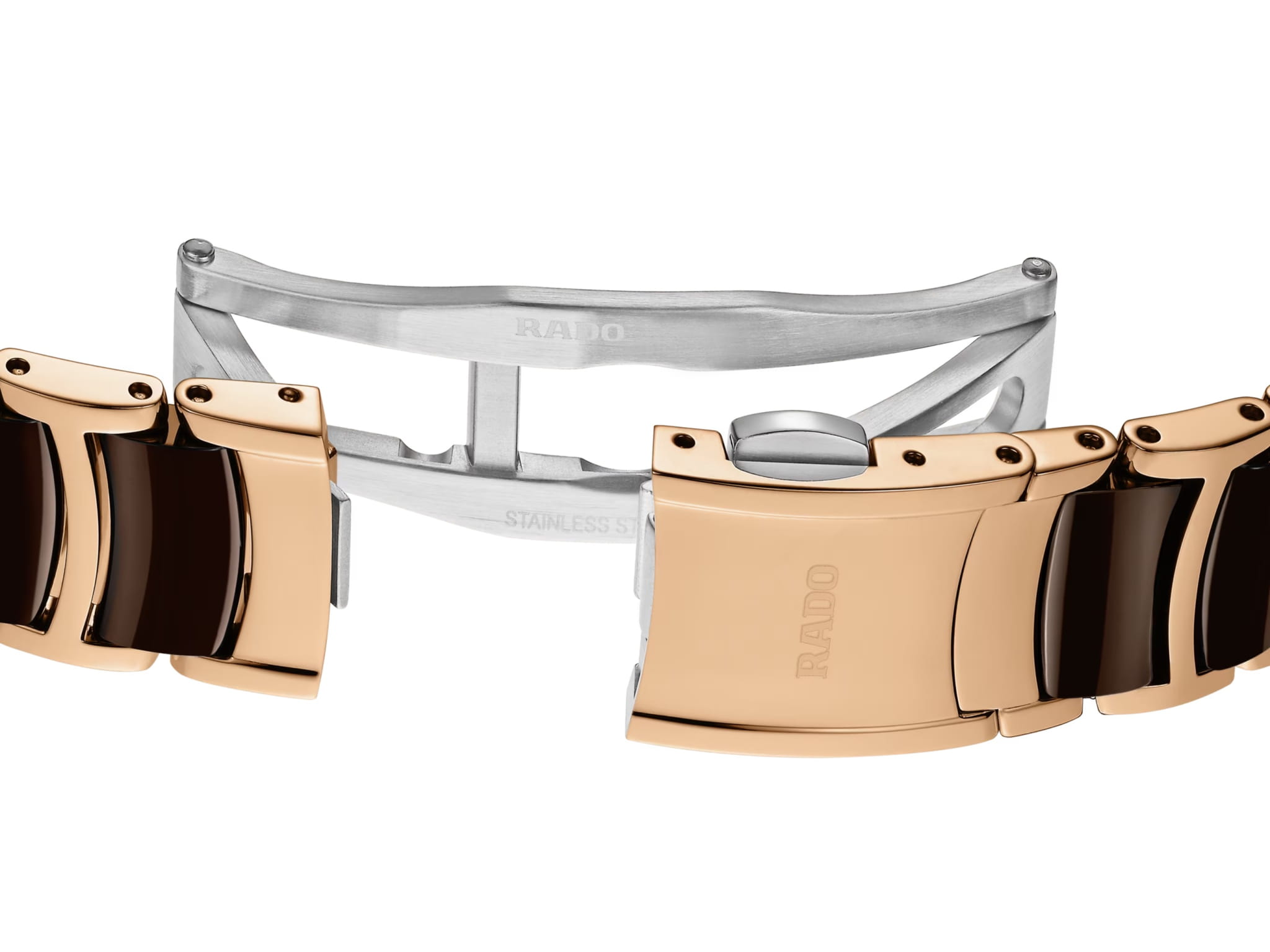 Швейцарские женские механические часы с автоматическим подзаводом Rado Centrix Automatic Diamonds R30019302. Корпус часов изготовлен из нержавеющей стали с PVD-покрытиемPVDУльтратонкое покрытие наносится в технике вакуумного напыления, сочетает в себе нитрид титана особой прочности со слоем золота или оксида хрома. Несёт в себе декоративную или защитную функцию.. Браслет из стали и высокотехнологичной керамикиВысокотехнологичная керамикаИнновационный запатентованный Rado материал с гладкой или матовой поверхностью. Керамика за счёт кристаллической структуры обладает повышенной устойчивостью от возникновения царапин. Материал способен принимать температуру тела человека, обеспечивая невероятный комфорт при ношении. на раскладной застёжкеРаскладная застёжкаТакой тип застёжки используется только на браслетах из металла. Она никогда не раскрывается полностью, происходит разделение на 2 и более частей. Раскладывающая застёжка снизит вероятность потери часов к минимуму.. Сапфировое стеклоСапфировое стеклоПрочный и надёжный материал из кристалла сапфира синтетического происхождения, характеризующийся особой твёрдостью и устойчивостью к царапинам и повреждениям. устойчивое к мелким механическим повреждениям. Класс водозащиты: 50 метров, позволит защитить корпус от случайных брызг или капель дождя. Окошко даты находится в положении 6 часов.