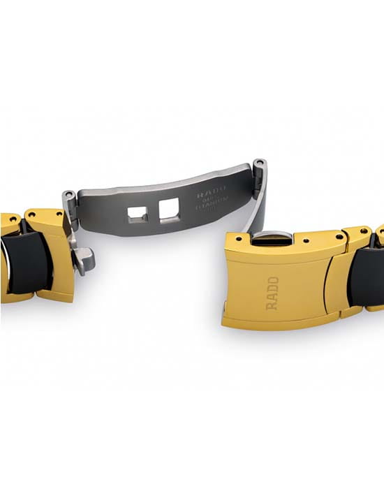 Аксессуар станет достойным дополнением к образу солидного и делового мужчины. Это стильная деталь современного имиджа, особый шик ей придают 12 бриллиантов цвета Top Wesselton в 0,045 карат. Наручные часы с автоподзаводом работают за счёт калибра ETA C07.611, который отличается увеличенным запасом хода до 80 часов. Понаблюдать за движением частиц механизма можно через прозрачную заднюю крышку. Надёжный корпус из хирургической стали 316L. Браслет имеет вставки из высокотехнологичной керамикиВысокотехнологичная керамикаИнновационный запатентованный Rado материал с гладкой или матовой поверхностью. Керамика за счёт кристаллической структуры обладает повышенной устойчивостью от возникновения царапин. Материал способен принимать температуру тела человека, обеспечивая невероятный комфорт при ношении.. Износоустойчивое PVD-покрытиеPVDУльтратонкое покрытие наносится в технике вакуумного напыления, сочетает в себе нитрид титана особой прочности со слоем золота или оксида хрома. Несёт в себе декоративную или защитную функцию. золотистого цвета. Стекло из сапфира. Апертура даты. Диаметр корпуса: 38 мм.