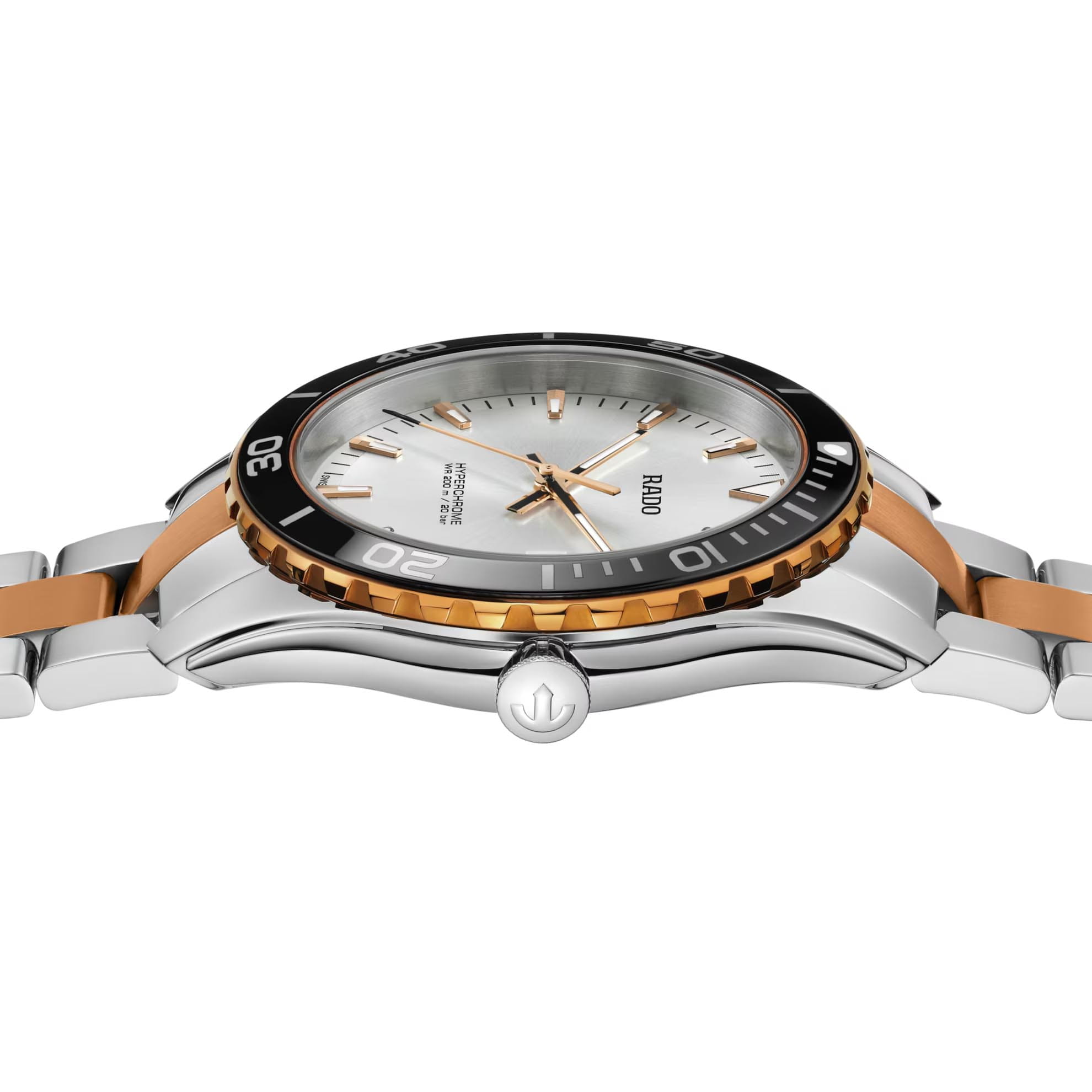 Мужские кварцевые часы Rado HyperChrome — это стильный и современный аксессуар с динамичным дизайном. Корпус диаметром 44 мм и толщиной 11,7 мм выполнен из нержавеющей стали. БезельБезельВнешний ободок, закрепляющий стекло. В спортивных часах так называется поворотное кольцо с делениями на циферблате, выполняет роль таймера – замеряет отрезки времени на шкале. Неподвижный безель – элемент декора. Однонаправленно вращающийся безель на дайверских часах позволяет фиксировать моменты погружения и выныривания на поверхность. — комбинированный, из нержавеющей стали с PVD-покрытиемPVDУльтратонкое покрытие наносится в технике вакуумного напыления, сочетает в себе нитрид титана особой прочности со слоем золота или оксида хрома. Несёт в себе декоративную или защитную функцию., с метками из Super-Luminova®. Циферблат синего цвета оформлен индексами и стрелками с люминесцентным покрытиемЛюминесцентное покрытиеПозволяет считывать показания времени в темноте. Производители наносят на стрелки, часовые индексы, безель или поверхность циферблата светонакопительный состав, дающий холодное свечение. Super-Luminova®, обеспечивающим хорошую читаемость в темноте. Циферблат защищён сапфировым стекломСапфировое стеклоПрочный и надёжный материал из кристалла сапфира синтетического происхождения, характеризующийся особой твёрдостью и устойчивостью к царапинам и повреждениям. с антибликовым покрытиемАнтибликовое покрытиеСлой оксида металла в 0,13-0,3 микрон, благодаря которому стекло часов не бликует и не отражает свет. Антибликовое покрытие уменьшает отражение света в 10 раз, обеспечивая отличную читаемость показателей циферблата.. Механизм — кварцевый калибр R073. Водонепроницаемость 200 wr, что позволяет плавать и нырять. Часы оснащены браслетом из нержавеющей стали с PVD-покрытиемPVDУльтратонкое покрытие наносится в технике вакуумного напыления, сочетает в себе нитрид титана особой прочности со слоем золота или оксида хрома. Несёт в себе декоративную или защитную функцию. и застёжкой «бабочка» с кнопкамиЗастёжка "бабочка"Такой вид застёжки дополняется предохранителями, помогающими избежать случайного раскрытия браслета. Обладают изящным исполнением. из титана и нержавеющей стали. Окошко даты расположено в положении 3 часов. Универсальный выбор для тех, кто ценит элегантность, надёжность и современный стиль.
